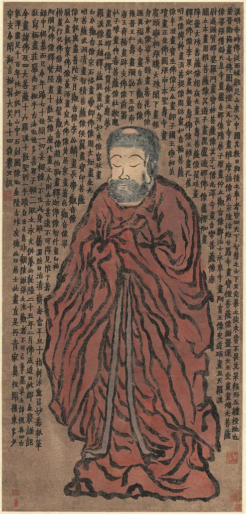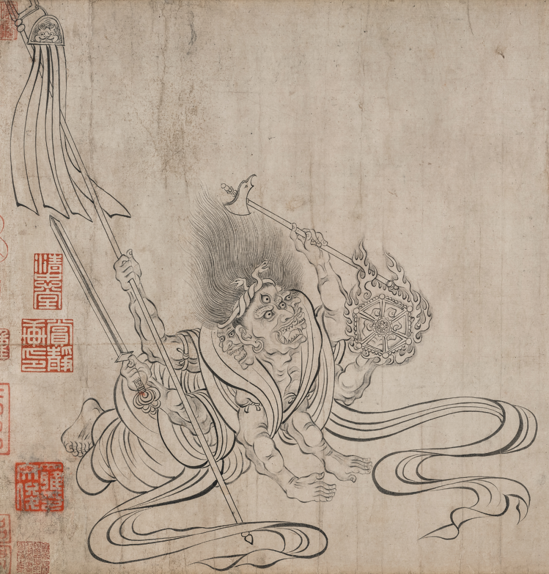 送子天王的圖我看過很多次了,我以前真不明白,但我看到真跡,我覺得真牛逼,那不是一般人畫的出來的,吳道子那真的很扯,扯爆了的那種扯,真的是開眼界了,他無愧於他所有的美譽,真的得看,你就會知道線條到底能做到什麼層度,你就會知道中國人的繪畫根本不是因為不會素描或透視,而是他們有自己的一個體系,那個線條就只有線,但創造了一切,那是很恐怖的視覺經驗,因為我看過很多次送子天王的圖片或者印刷,但是真跡那不是一個等級的,那些圖片跟印刷根本就無法展現那幅畫到底有多牛逼,因為你看印刷或圖片是沒辦法明白為什麼線具有質感,就是那些工筆白描,那個線本身就代表了繪畫對象,人的線就是皮膚,火的線就是火,毛的線就是毛,所以中國人不需要去畫細節,因為線條本身就擁有質感,一般人根本沒有辦法那麼精準的畫出那些墨色的差異,那種視覺觀感真的很震撼,因為畫面很簡單,但是那創造出來的一切,用非常非常簡單的手段表達出一個非常複雜的對象虽然我觉得扫描版的图片就已经很牛逼了,但听了她的口述不由得神往,真想有机会去亲眼看看: