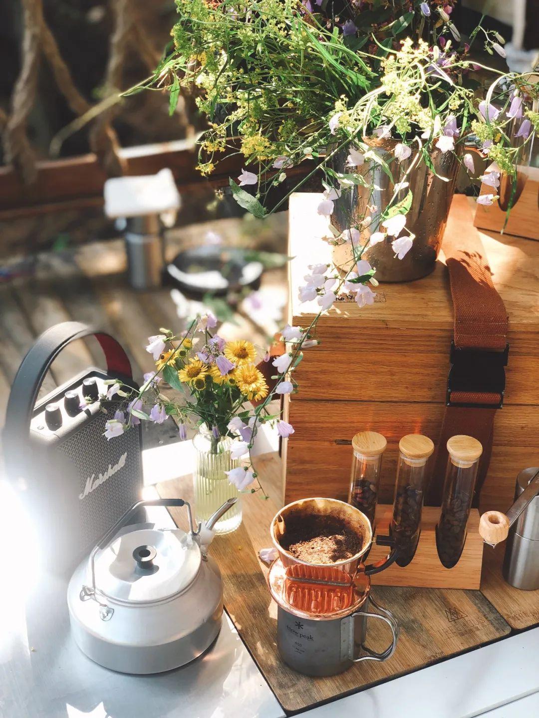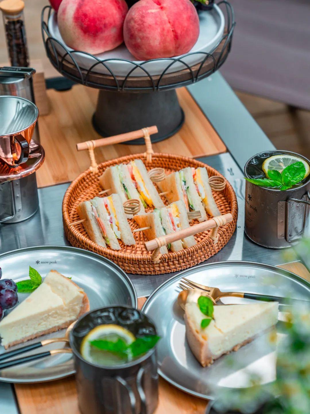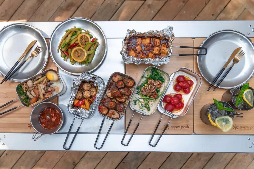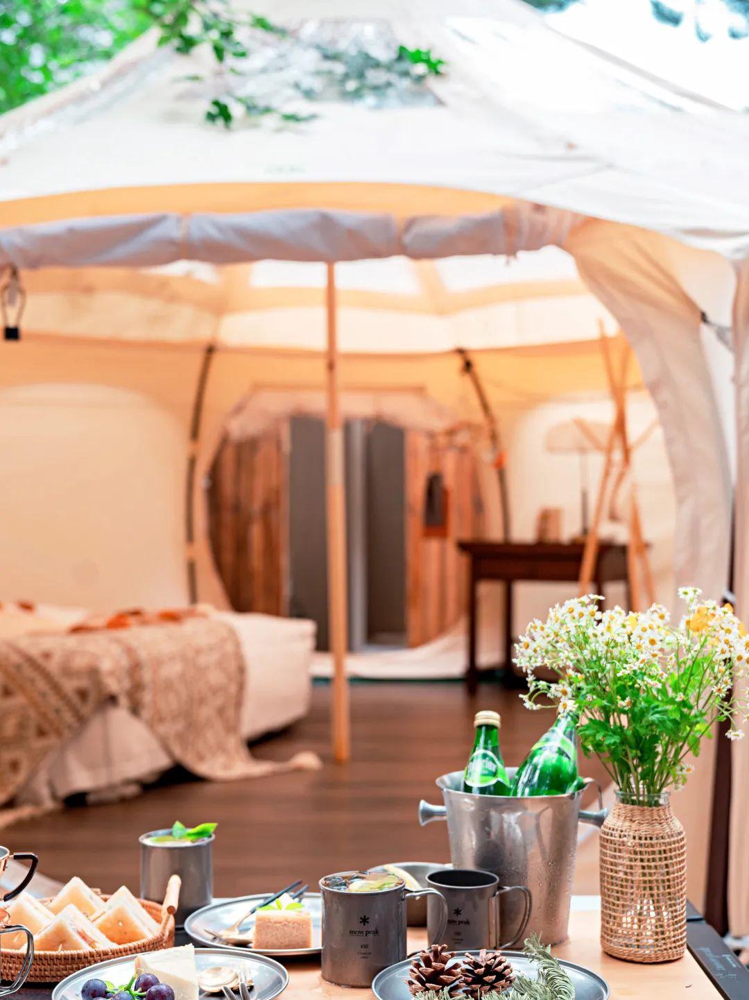 在美食方面,营地非常尊重当地寺庙的饮食习俗,主打素食主义,尽可能用蘑菇、鸡蛋、豆腐代替肉食。以斑斓的山林为背景,在自然中的小方桌上,来一顿山野气息的下午茶亦或是露营气息的晚餐,视觉与味蕾的双重满足。