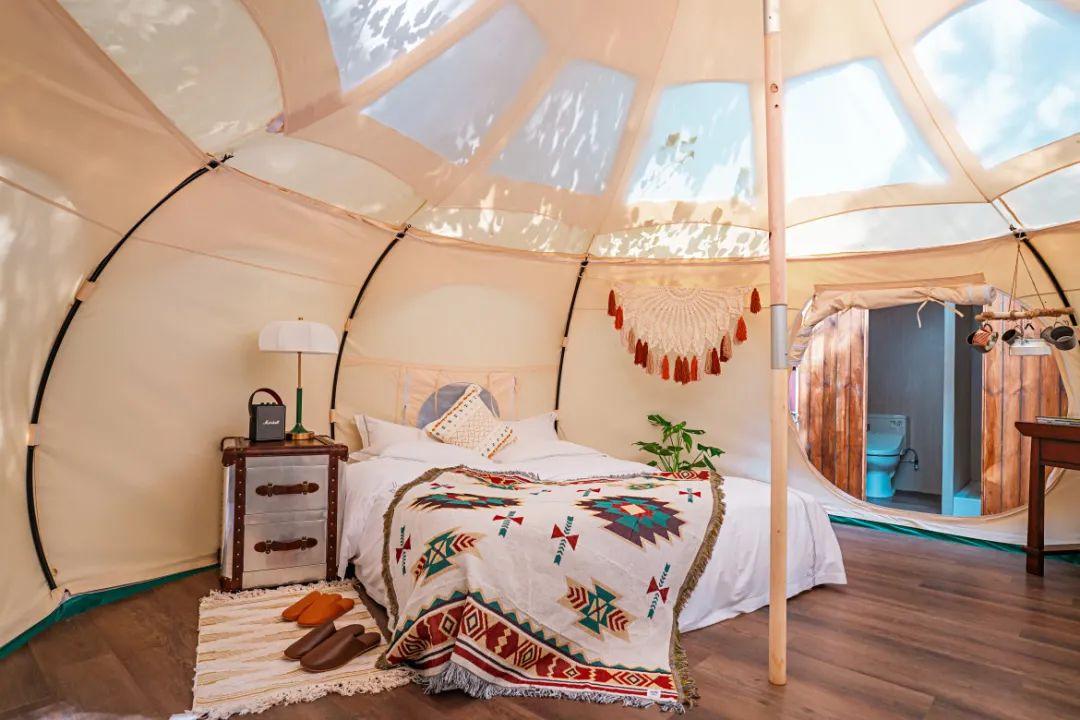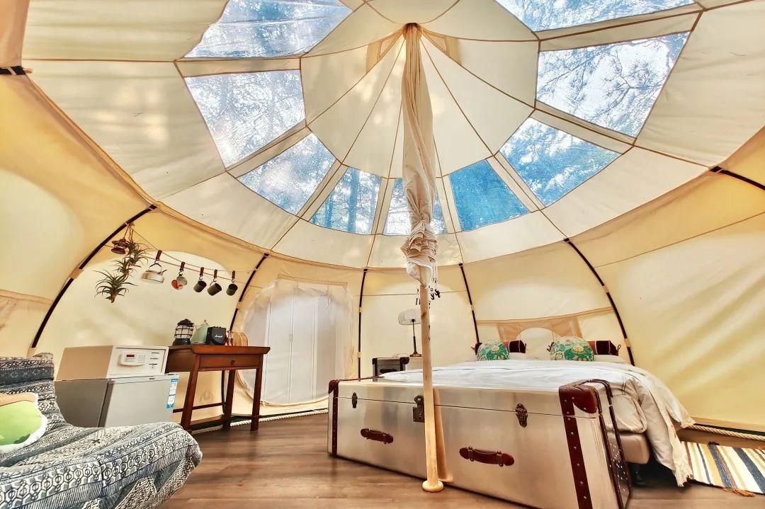 营地分为轻奢帐篷和春帐两种类型的帐篷,提供拎包入住一价全包式服务,在户外中享受家一般的放松和舒适,亲子出游也可以轻装上阵。