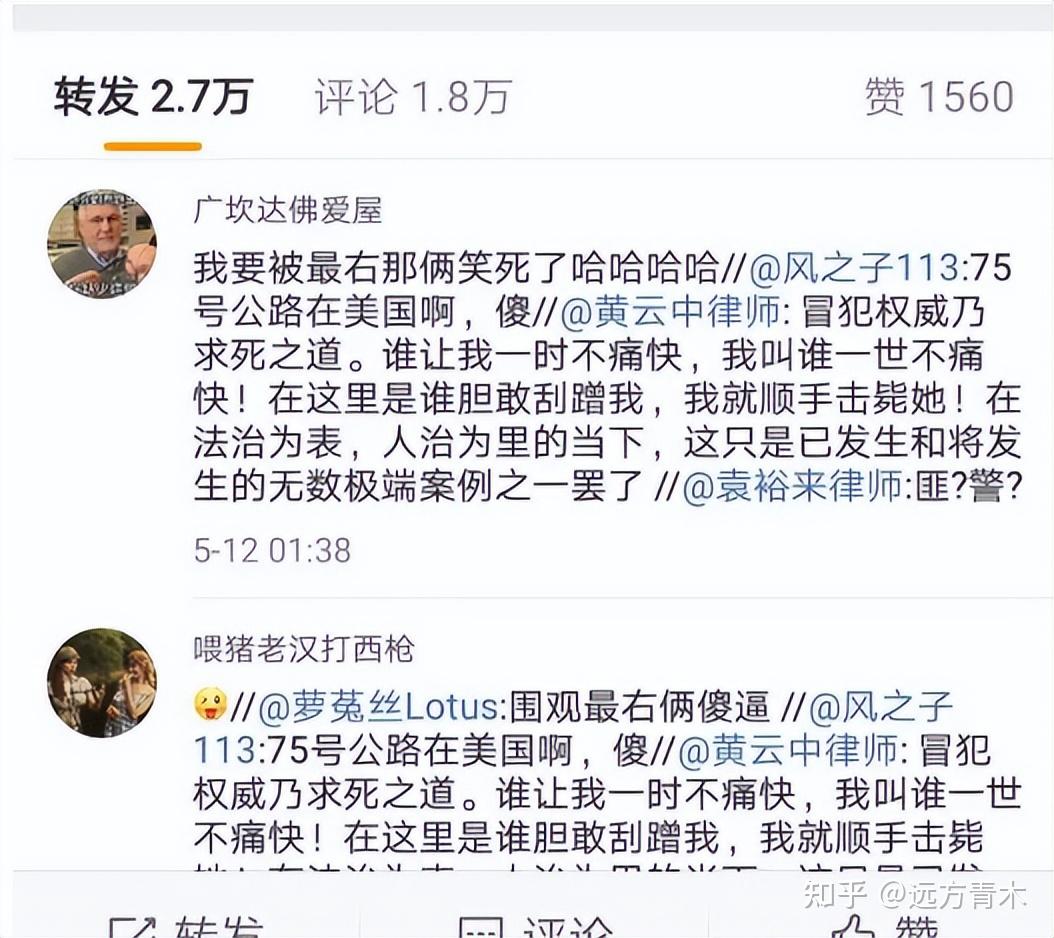 另一位也是要么挑中国毛病,要么夸外国好的黄云中律师,跟评说:“冒犯权威乃取死之道。谁让我一时不痛快,我就让谁一世不痛快!在这里是谁胆敢剐蹭我,我就顺手击毙她!在法治为表,人治为里的当下,这只是已发生和将发生的无数极端案例之一罢了”。
