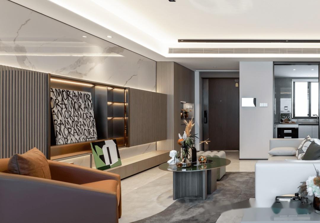 入户超大玄关柜,客厅的无主灯设计,岩板+木饰条相结合的客厅背景墙也是交付标准,实用性与艺术性双双满格。