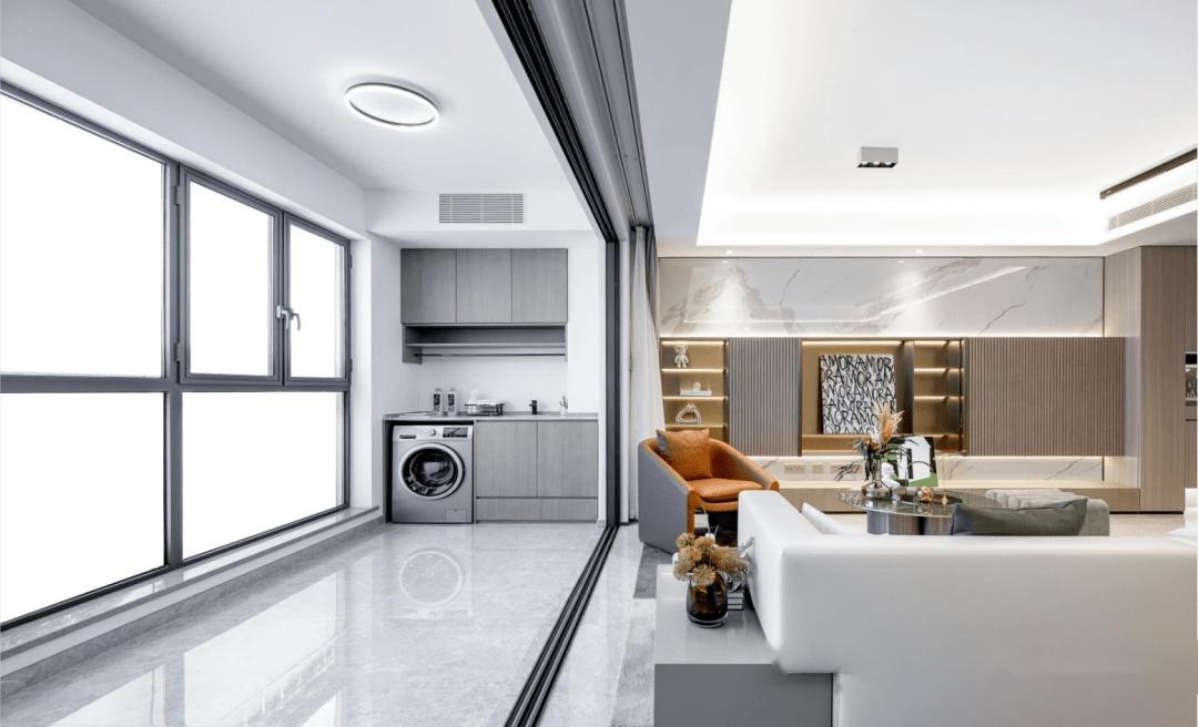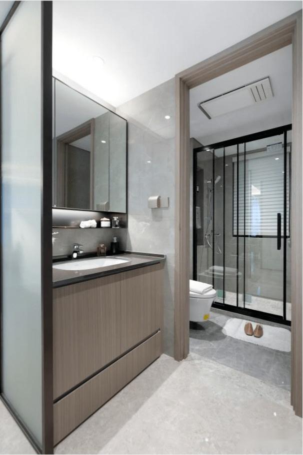 还有卫生间的淋浴间三段式移门设计、壁挂马桶、壁龛、电热毛巾架、上轨道推拉门等等等一系列细节设计就像一个个彩蛋,充满人性化的考量,满足了住户在生活上精致的气质。