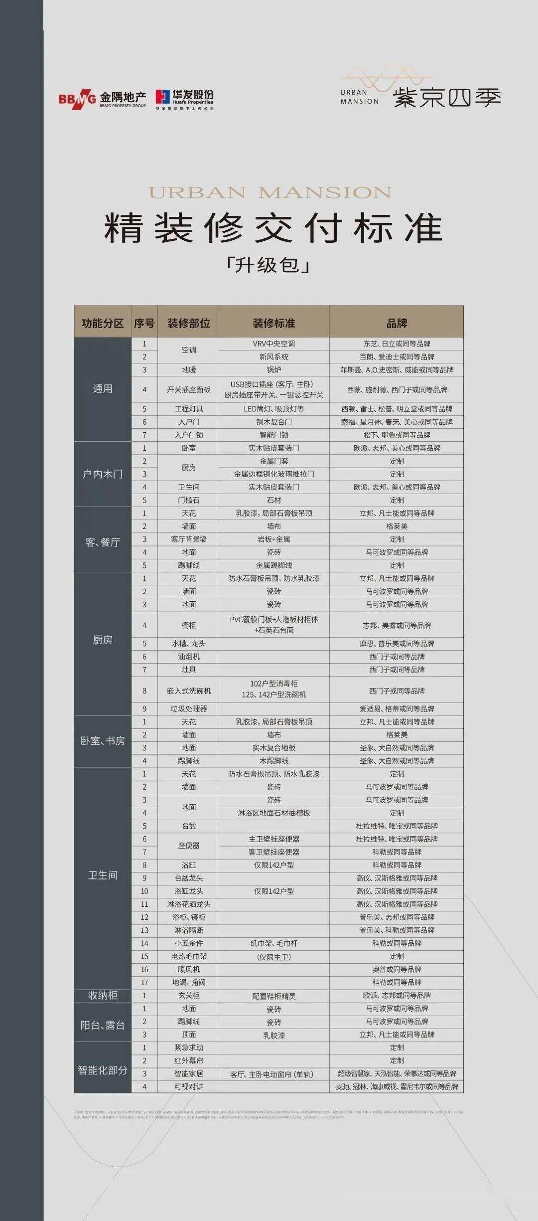 最后,项目升级装修的标准,也相当的用心,配置了东芝、日立或同等品牌的中央空调,百朗、爱迪士或同等品牌的新风系统,菲斯曼、AO史密斯、威能或同等品牌的地暖,厨房有西门子的油烟机、灶具、洗碗机(其中102㎡是消毒柜),卫生间的品牌多是杜拉维特、唯宝、高仪、科勒、汉斯格雅等。(实际交付标准以项目公示为准)