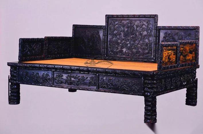 ▼花梨仿竹材四季花卉罗汉床 清晚期