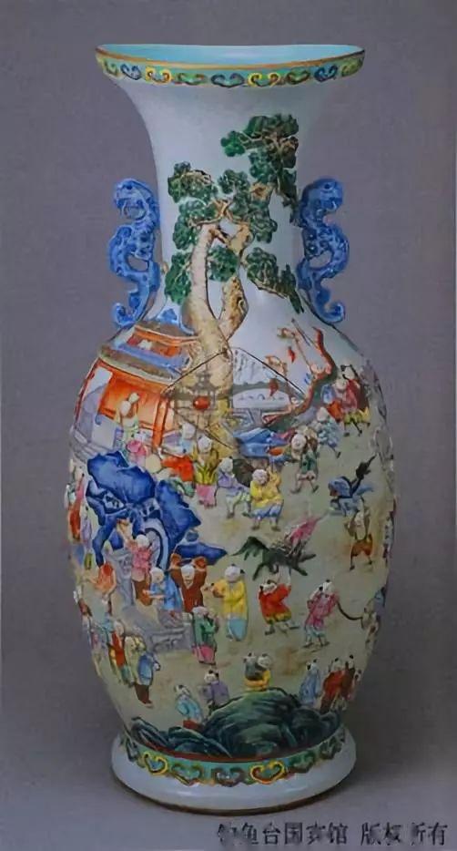 ▼粉彩凸百子龙灯夔凤耳瓶 清(嘉庆)