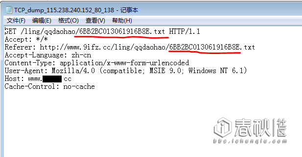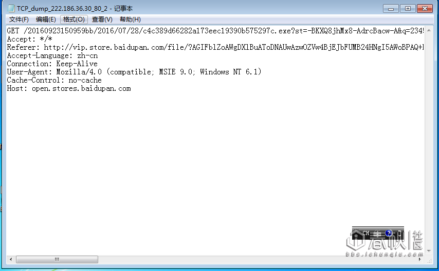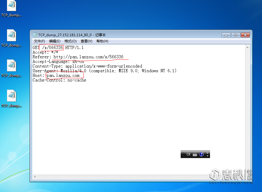 从文件名可以看到,这个TCP连接到了27.152.181.114这个地址,而端口是80,显而易见这八成是一个Http协议的通讯,我们用记事本直接打开这个文件,发现它访问了http://pan.lanzou.com并且Get x/56636里的东西