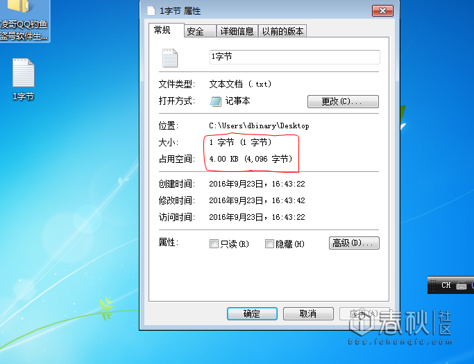 现在我们再来看看这个,我创建了一个文本文件,里面只有一个字母,就是只有一字节,为什么会占用磁盘4KB的空间呢