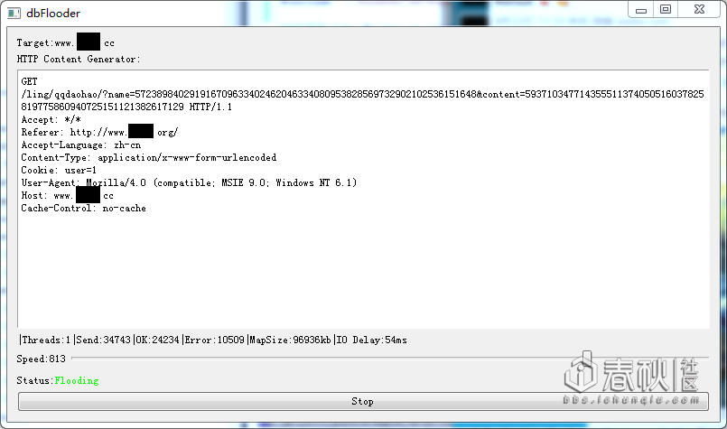 执行dbFlooder,发现数据发送成功,我们尽量地调整发送的数据速度,使其不被其防火墙过滤而拉黑我们。看了看,效果似乎还不错。