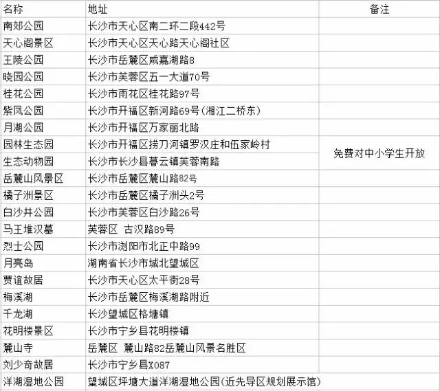 免费畅游的景区包括:长沙的石燕湖、天心阁、黑麋峰森林公园,武汉清凉寨、东湖游船、木兰湖、木兰天池、长江游船、古琴台、奇石馆,南昌的梅岭狮子峰景区、梅岭竹海明珠景区、小平小道景区、凤凰沟风景区,合肥的杨振宁旧居、包公园、李鸿章故居陈列馆等。