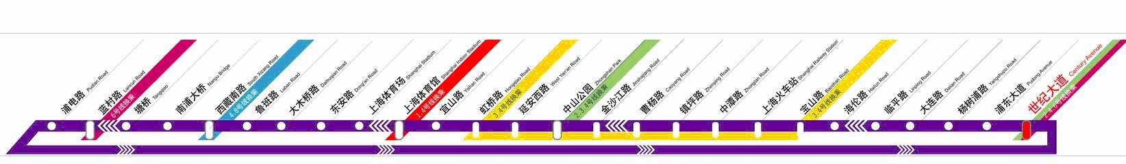 这个线路图的问题在于,它不能直观地表现出这是一条环线。比如你在世纪大道站,想去上海体育馆站,那看到这张图,因为乘坐其他线路的时候只要是写在前面黑色字体的车站就肯定可以乘到,所以你很自然地就会站这儿等车。但实际上从世纪大道去上海体育馆如果从外圈走的话就太绕了。