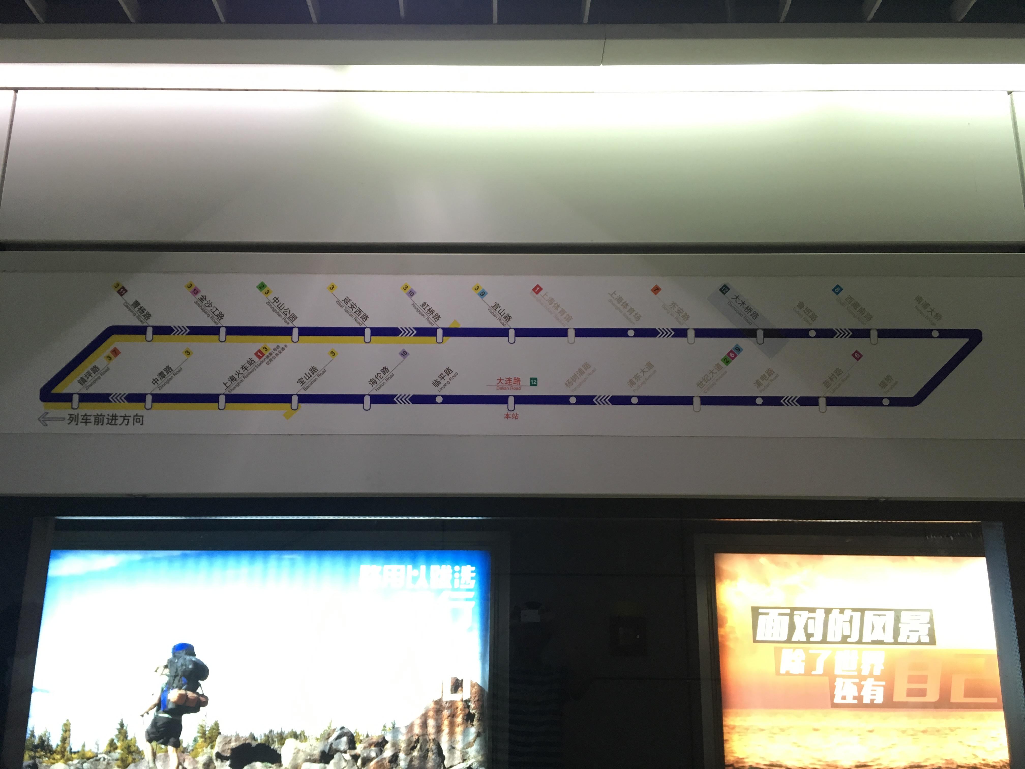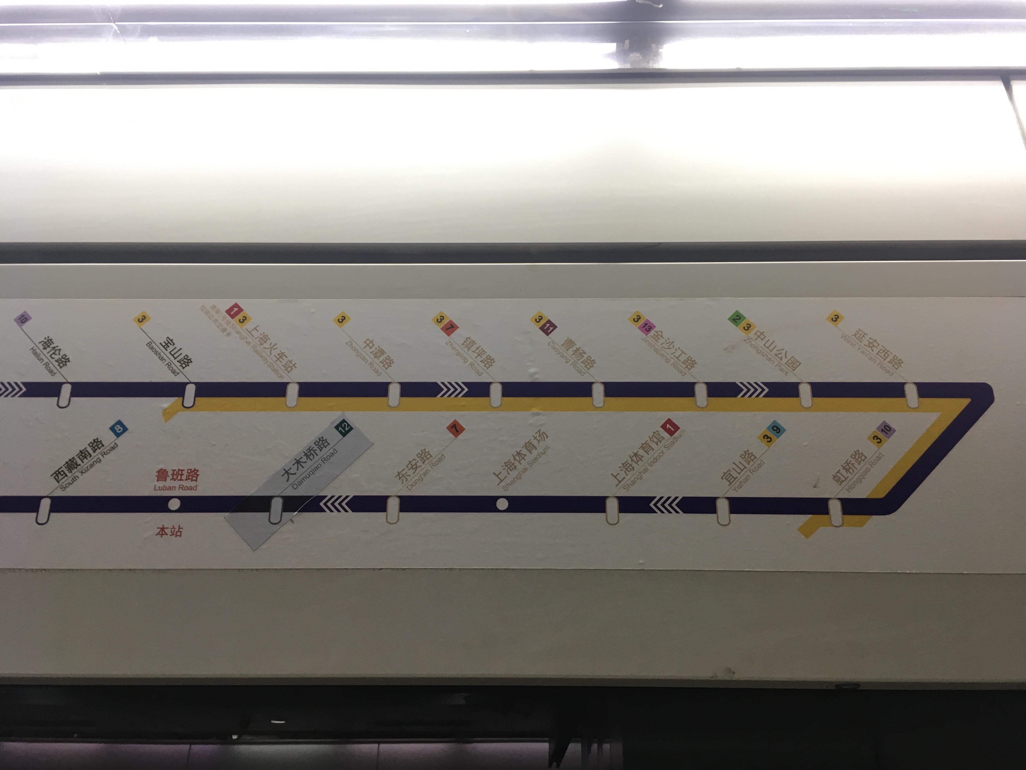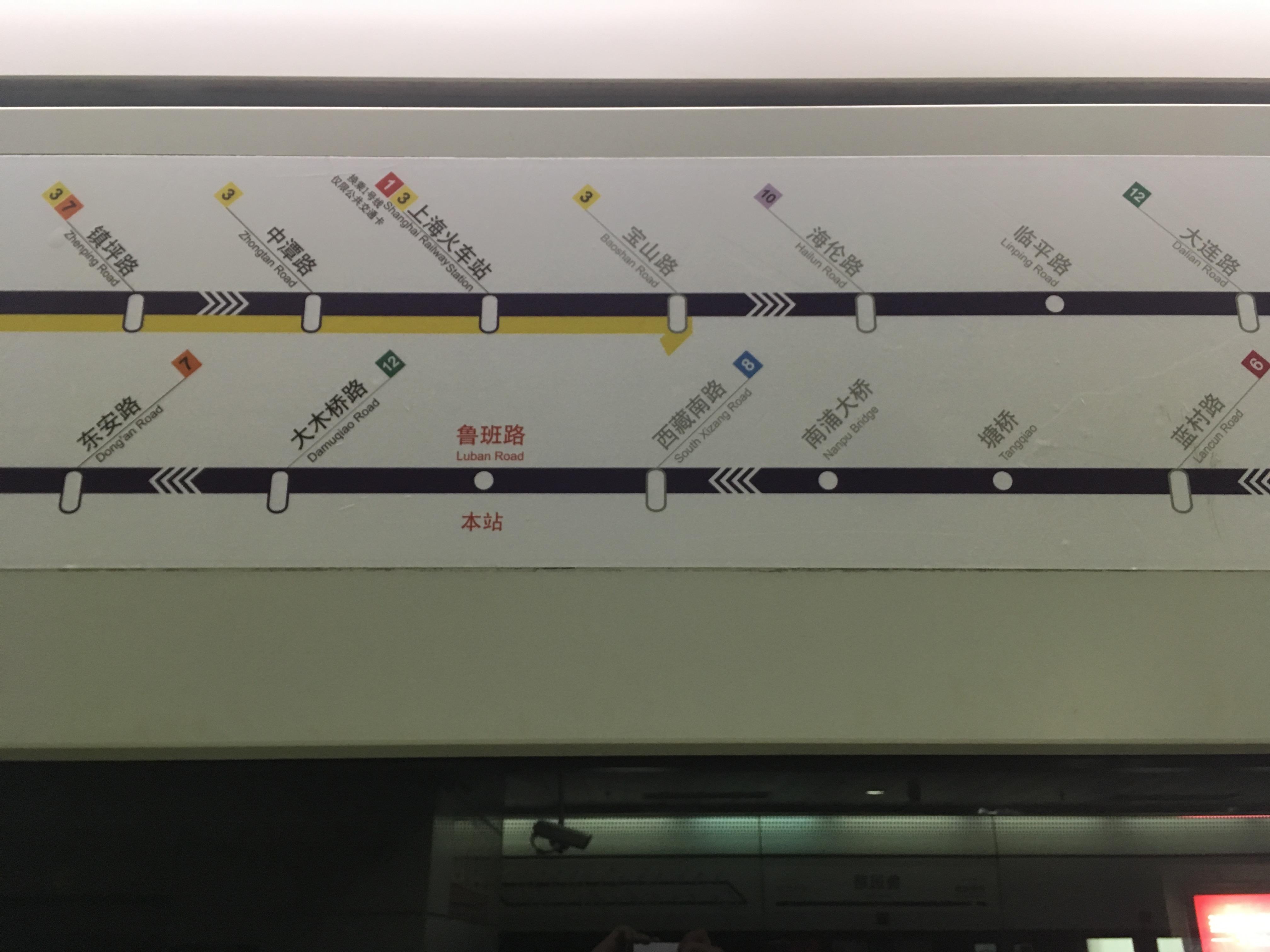 那么对于在鲁班路站想去上海火车站站的乘客,他们看到灯箱上的上海火车站往外圈那边指,自然就去外圈站台等车,但是再抬头一看,头顶的线路图却把上海火车站站显示为「已驶过车站」,实在是很让人摸不着头脑。