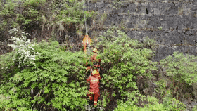 由于岩壁四周荆棘密布,且岩壁湿滑,现场救援人员只能踩着布满青苔的岩石,抓住藤蔓树枝艰难地往上爬。