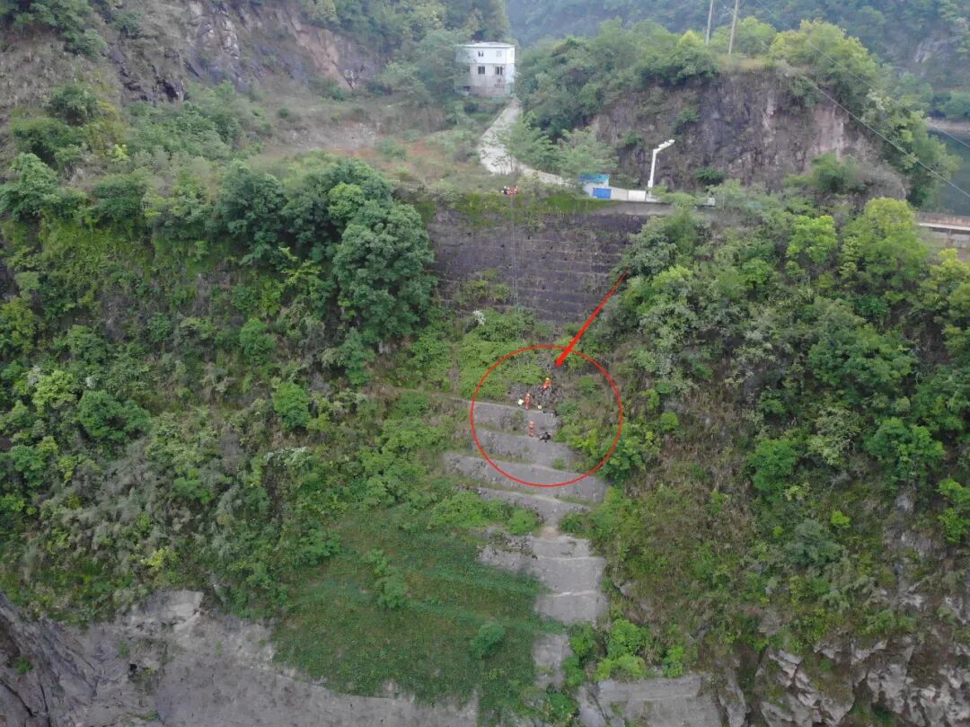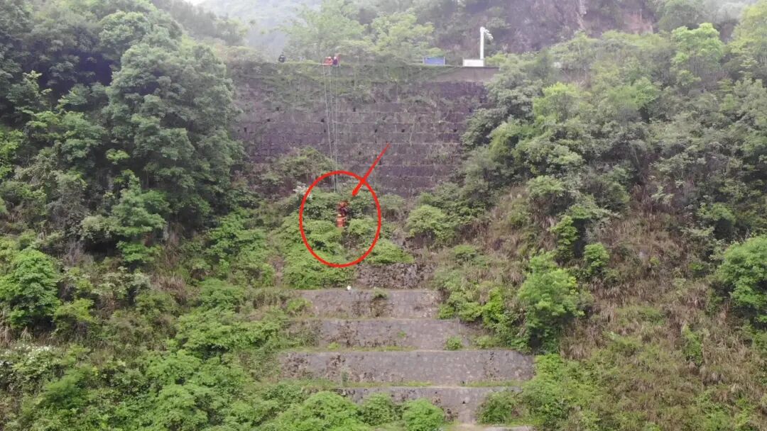 下到底部的救援人员为被困者做好保护措施后,借着手电照明光,先把被困者拉至到稍微宽一点的台阶上。顺着一级级台阶的往上挪动,岩壁越来越陡峭。