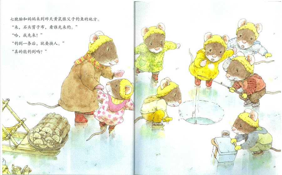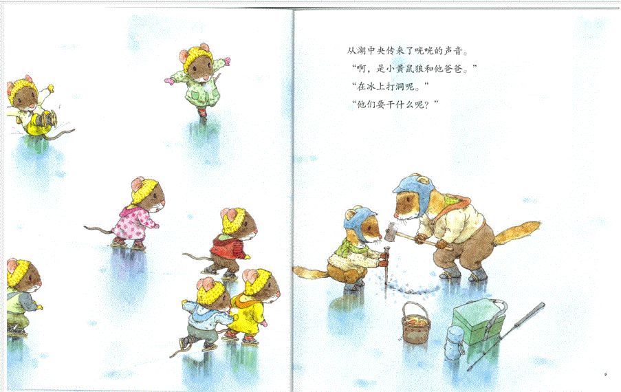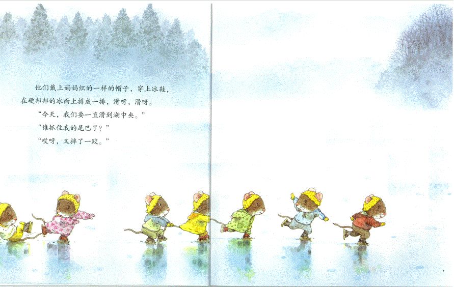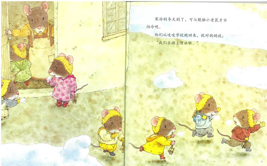 寒冷的冬天到了,可七胞胎小老鼠才不怕冷呢。他们从吱吱学校跑回来,就对妈妈说:“我们去湖上滑冰啦。”