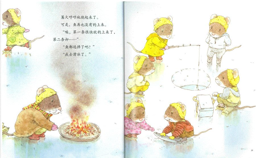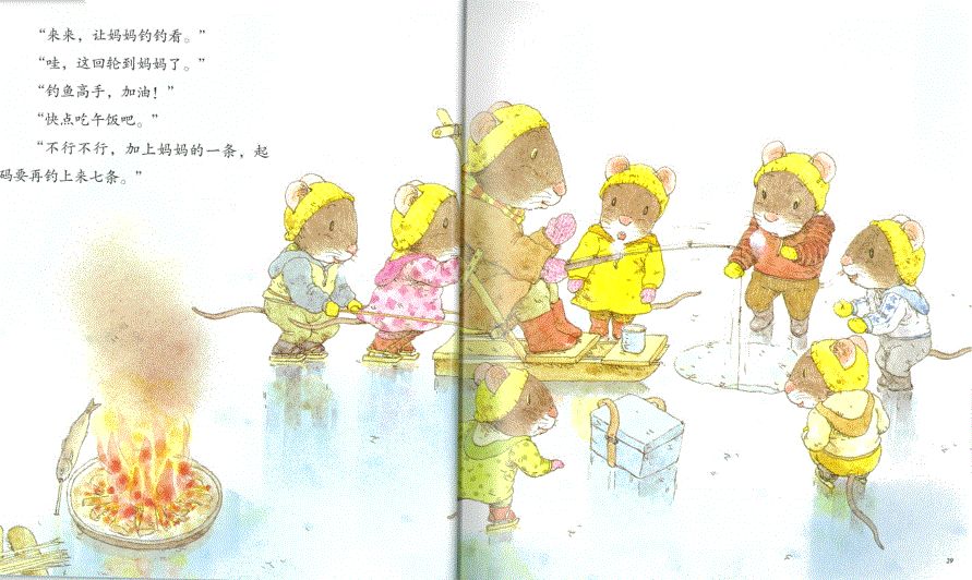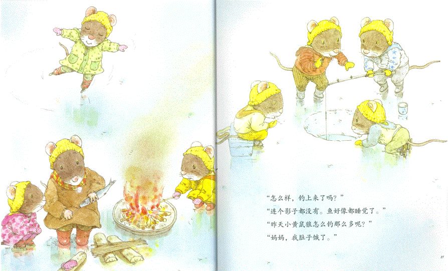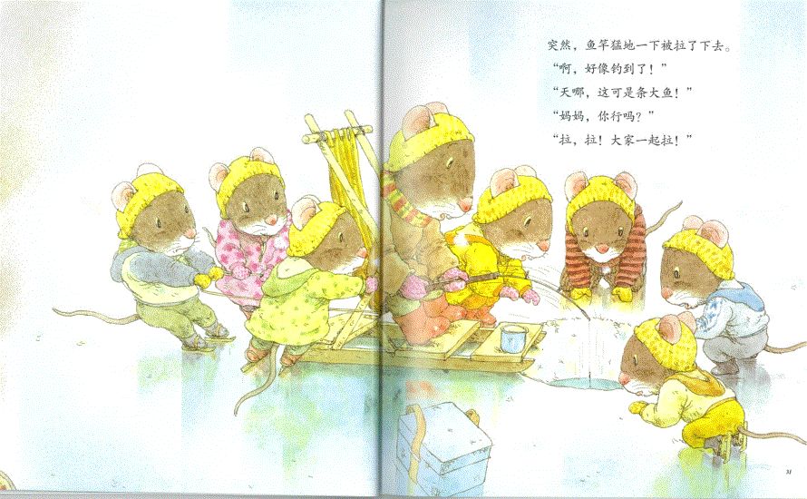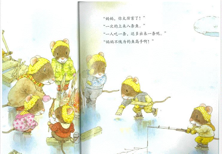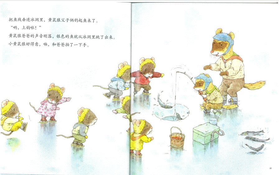 把鱼线垂进冰洞里,黄鼠狼父子俩钓起鱼来了。“哟,上钩啦!”黄鼠狼爸爸的声音刚落,银色的鱼就从冰洞里跳了出来。小黄鼠狼好得意,啪,和爸爸拍了一下手。