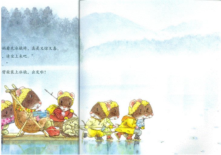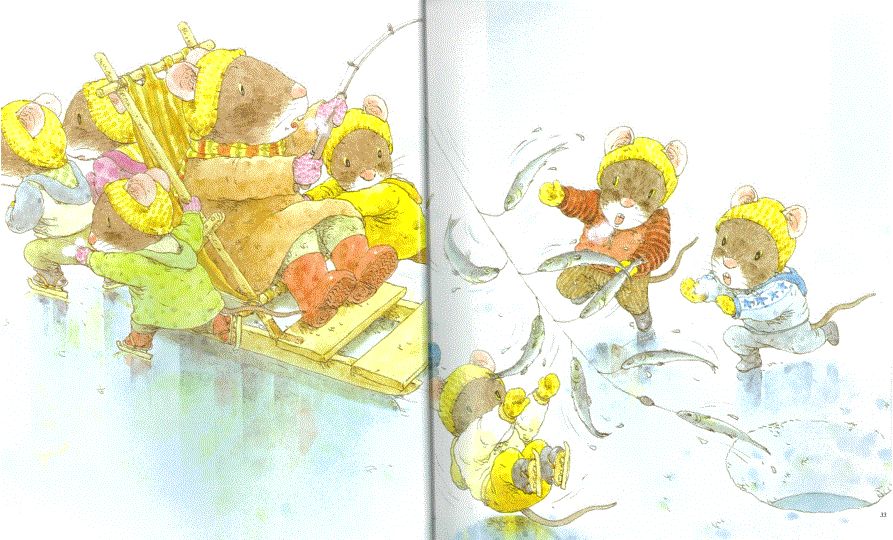 七胞胎小老鼠们用冰橇椅拉着妈妈,扛着多出来的一条鱼,回家了……