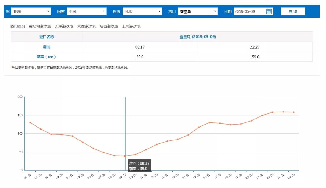 去之前可以提前查好潮汐表,如果正好赶上退潮最低点,那现在就已经可以开始赶海了,潮汐表直接百度搜就可以搜到,定位地点为河北省秦皇岛市,日期根据自己出行时间,下图是2019年5月9号的潮汐表,大概在早晨8点到9点的时间是潮水最低的时候