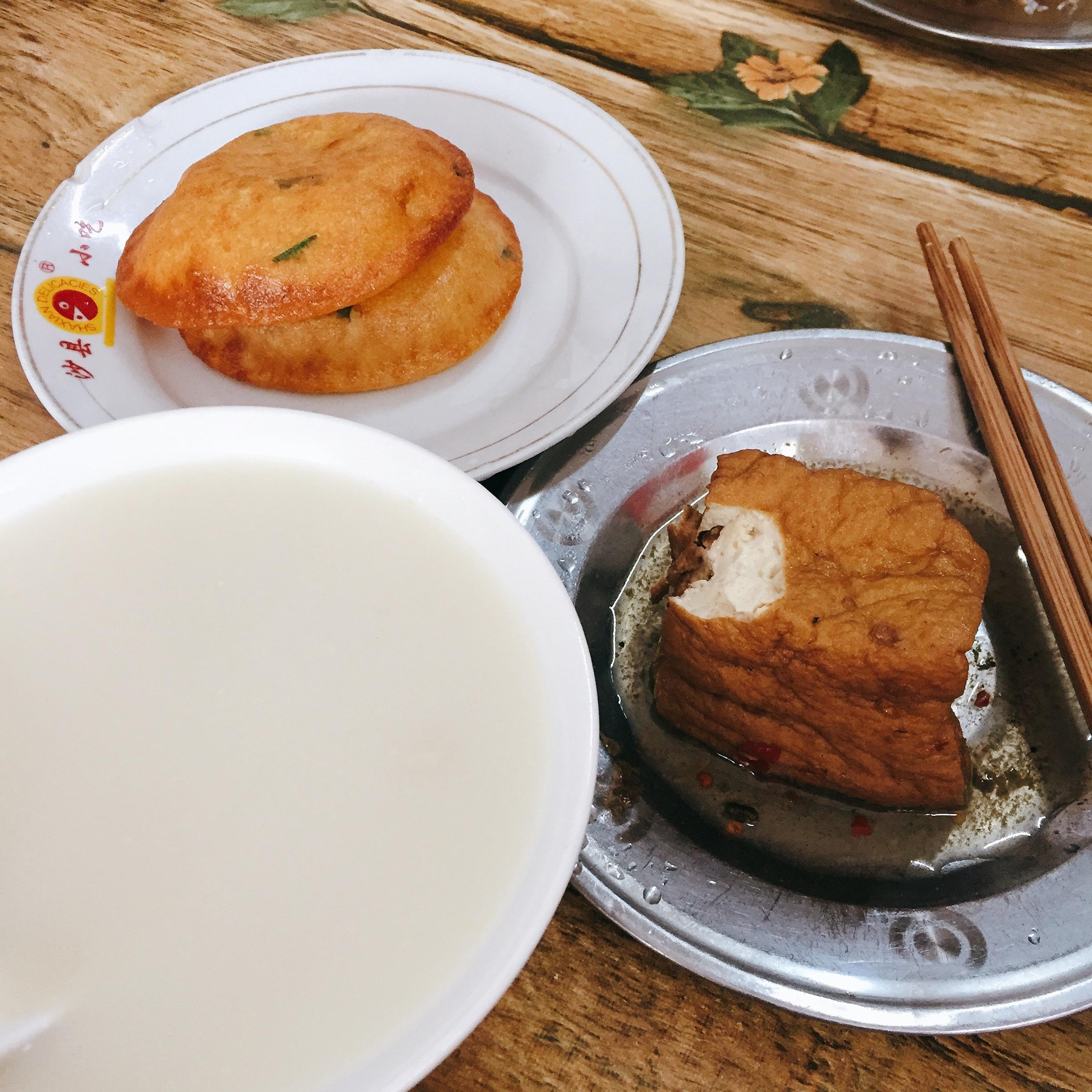 最后一天早上我们睡得很舒服,去泰宁的早市逛逛再吃个早饭,然后回客栈顺便在古街里逛逛。8点多去了菜市场,随便找了家早餐店吃了一碗排骨汤面(10元),游浆豆腐(3元),油饼(0.5元)。面的分量很足,味道清淡,游浆豆腐和油饼很好吃,要不是吃饱了,真的还想再来一块。