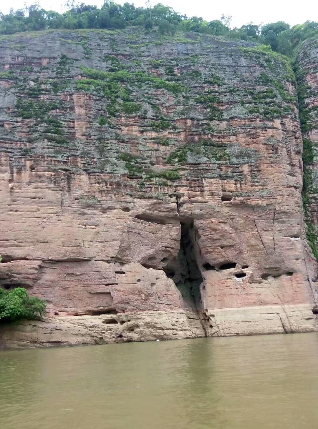 第二个地方是斜线天,也就是一线天。船还没靠岸导游就在广播里说年老体弱的,有心脏病的最好不要上去,山体很倾斜,每次只允许一个人过,也不能走回头路,队伍很有秩序地上去,但由于较倾斜,有些地方需要俯身下去,队伍挪动得很慢,不乏有的人怨声载道,催促前面的人不要停下来拍照,继续往前走之类的。里面虽然有几盏探照灯,但是周围的环境还是很暗,气氛有些压抑,爬完之后的感觉还好,算不上很有趣,大家一起爬的话比较有气氛。