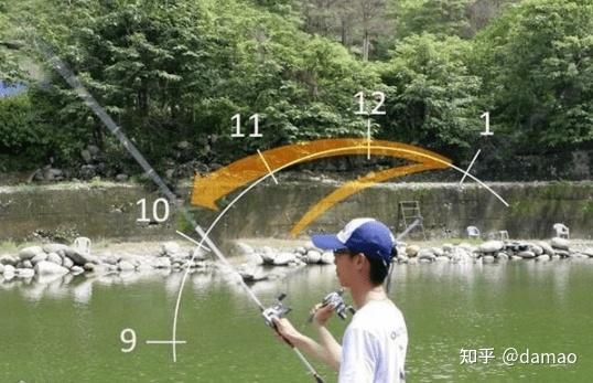 正确动作:先持竿斜向前(10点钟方向)指向抛投方向,向后甩动鱼竿到1点钟方向然后再向前甩动,到大约10点钟位置松开,鱼竿停住,指向出线的方向。在鱼塘里,抛投时基本用不着腰腹和大臂,只要小臂和手腕发力就足够了。