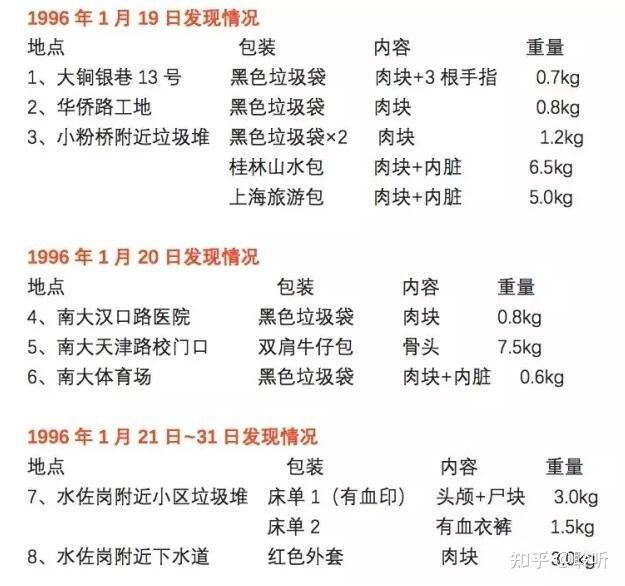 第二件尸袋被发现:此後,又在大澗銀巷13號垃圾堆發現裝有同樣屍塊的袋子。這一袋約重0.7kg。該環衛工人以為是豬肉,把袋子撿走。她結束工作回家,在家中清洗肉片時,發現裡面夾了有三根疑似手指,隨即報案。1月19日上午接到報警後,市局與環衛部門溝通後,做出了在相應範圍內重點捜査垃圾點的指示。警察立刻開始對周邊地區垃圾堆大範圍進行搜索,尋找碎屍過程中使用了軍犬。在南大南園小粉橋路段四個小區門口的垃圾箱內分別發現了兩個旅行包和兩個垃圾袋。 ——维基百科[1][2]3.凶手使用的交通工具: