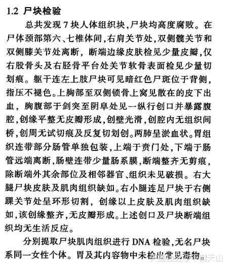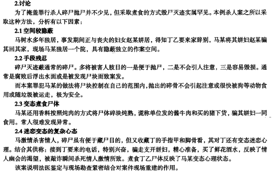 3.中年男子失踪,妻子称其南下打工。数年后,在其家原平房后农田深处发现尸体残块,缺失较多。破案后,系该男妻子与他人通奸,合谋将丈夫杀害并分尸,再煮熟,部分被喂狗,骨骼等埋藏农田。 。。。此三例,破案后总结均发现,与案发最初勘验判断有巨大差异。。。附3:杀人碎尸案例分析