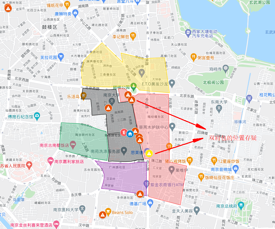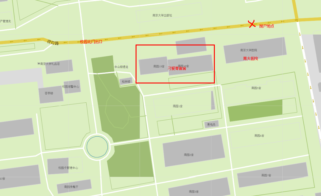 目击者最后看见刁的地点是紧靠南大附近的青岛路,她当时身穿红色外套。从她的装束来看,也没有任何的异常当然,往广州路方向≠要去广州路,因为如果要去广州路,可以直接从校区南门出去,而不用从北门出来绕一圈到广州路,她的宿舍离北门和南门的距离也是差不多的,所以有很大的可能性是进入了校区西面的小区内(标注绿色部分),也比较符合抛尸逻辑:凶手故意集中大量的把尸体抛在东面以此避免西面的居住地被排查到。