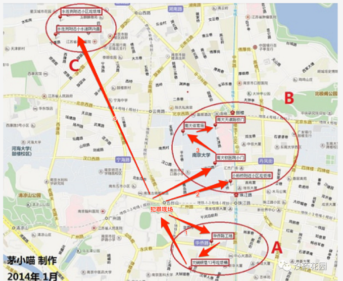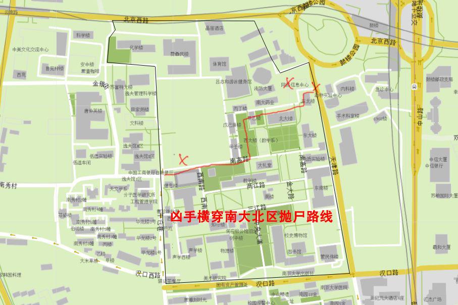 其中南京大学操场树洞里面有一处抛尸,说明凶手也是比较熟悉南京大学的环境的,否则不会贸然进去抛尸,但当时南京大学是对外开放的,附近居民对里面的环境熟悉属于正常,但我也比较倾向于凶手和南大也有某种关联——当然这种关联并不代表其是老师或者其他职员之类,也许是某种间接的关联,或者仅仅只是凶手经常去学校操场散步锻炼或者经常路过之类。