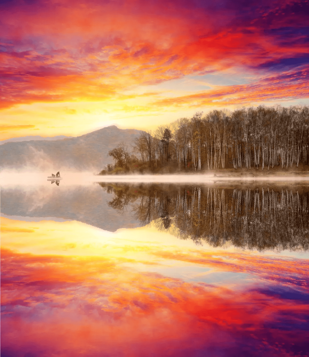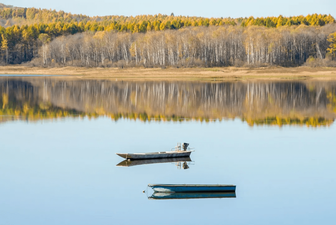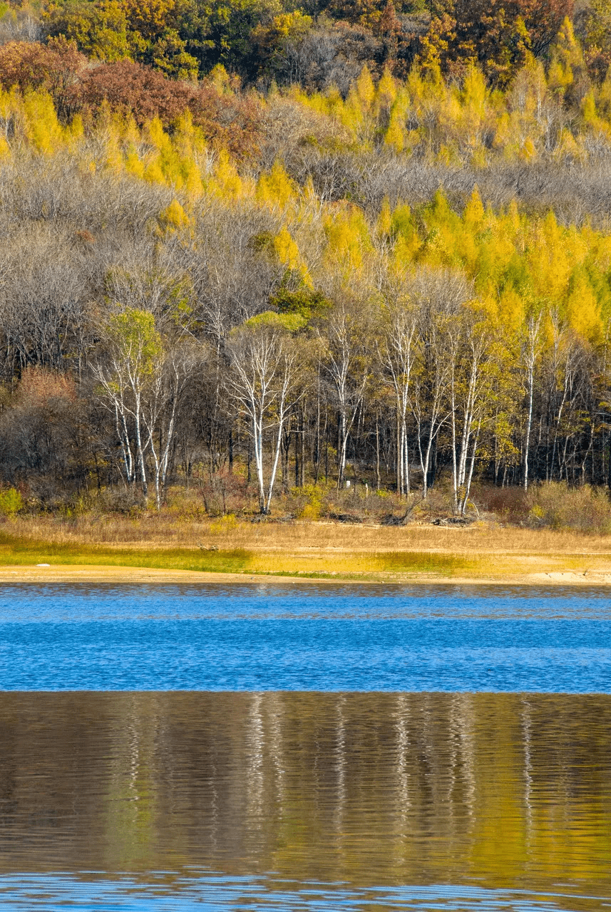 金秋时节,白桦树经秋霜点染,叶子由绿变黄,与碧蓝的水面形成冷暖的碰撞。