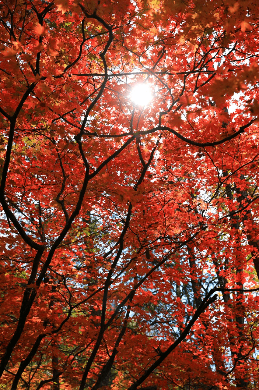 这片红叶编织的网,疏密有致,韵律十足,秋风略过,从缝隙透过来的光也跟着闪动,简直美得醉人。
