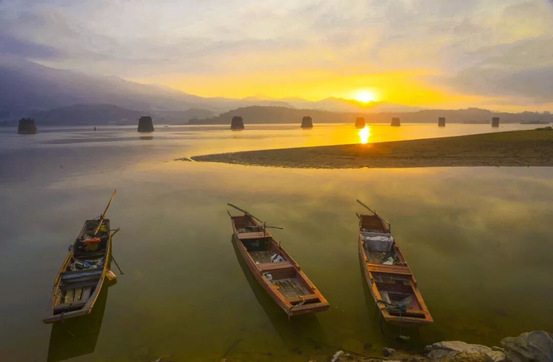 江面波光粼粼,远山时隐时现