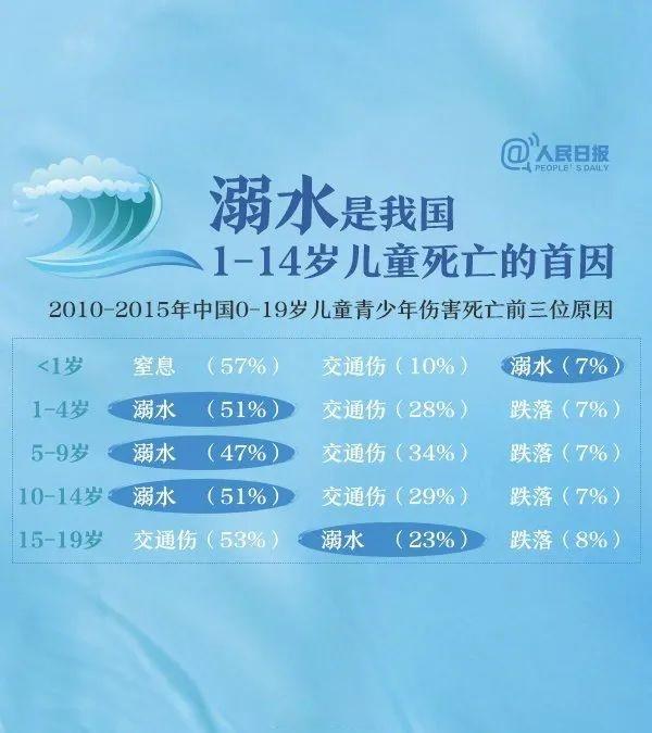 而我国每年约有5.9万人丧生于溺水,其中0-14岁儿童占总溺水死亡人数的56%,也就是说在中国平均每天约有161人溺亡,其中90名是儿童。