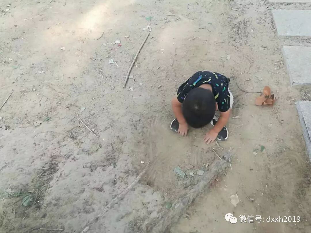 一会,小儿子在桥上玩够了,我便陪着他来到了桥头上。正好有个树荫,小儿子便玩弄起了一堆泥土,一会儿扬起来,一会儿用脚踩上去,泥土上留下了他的小脚印。孩子总是与土联系在一起的,一堆泥土成了孩子的乐土,而且玩得不亦乐乎。