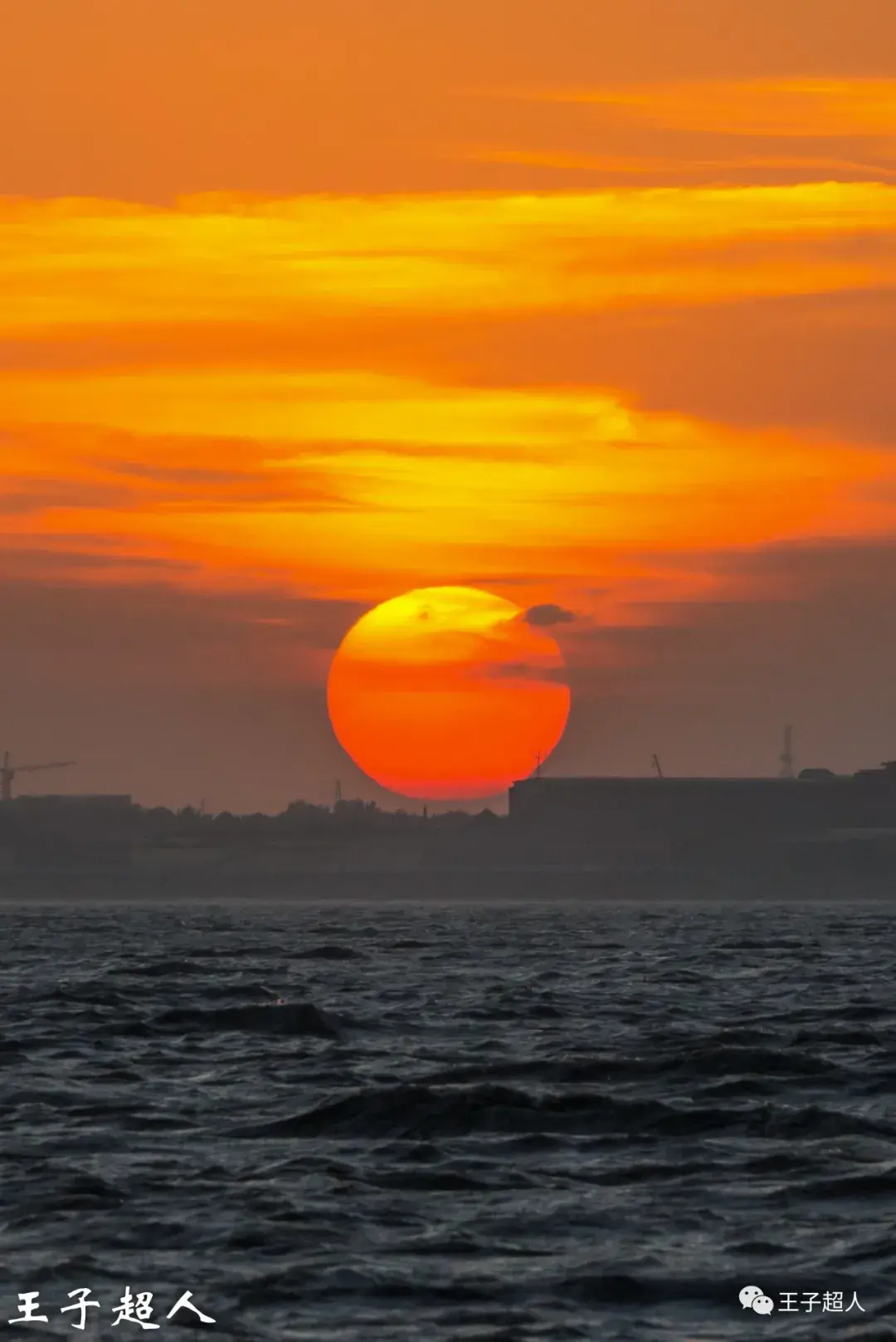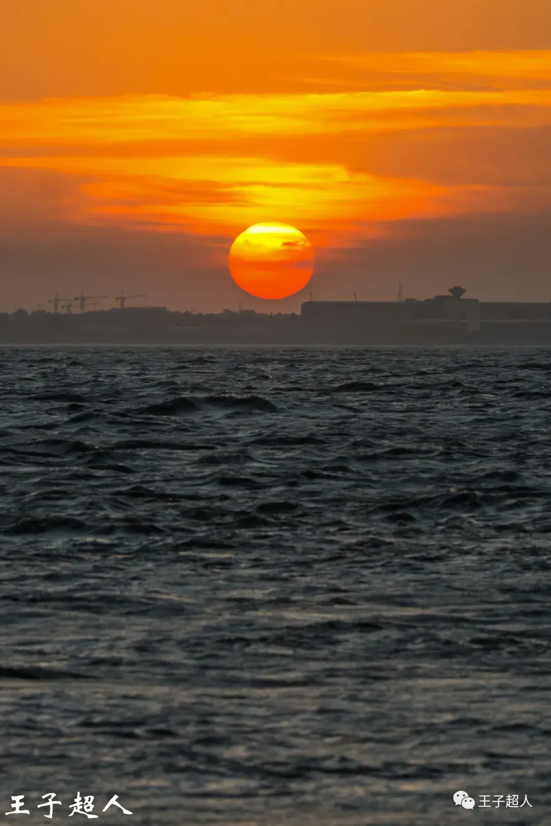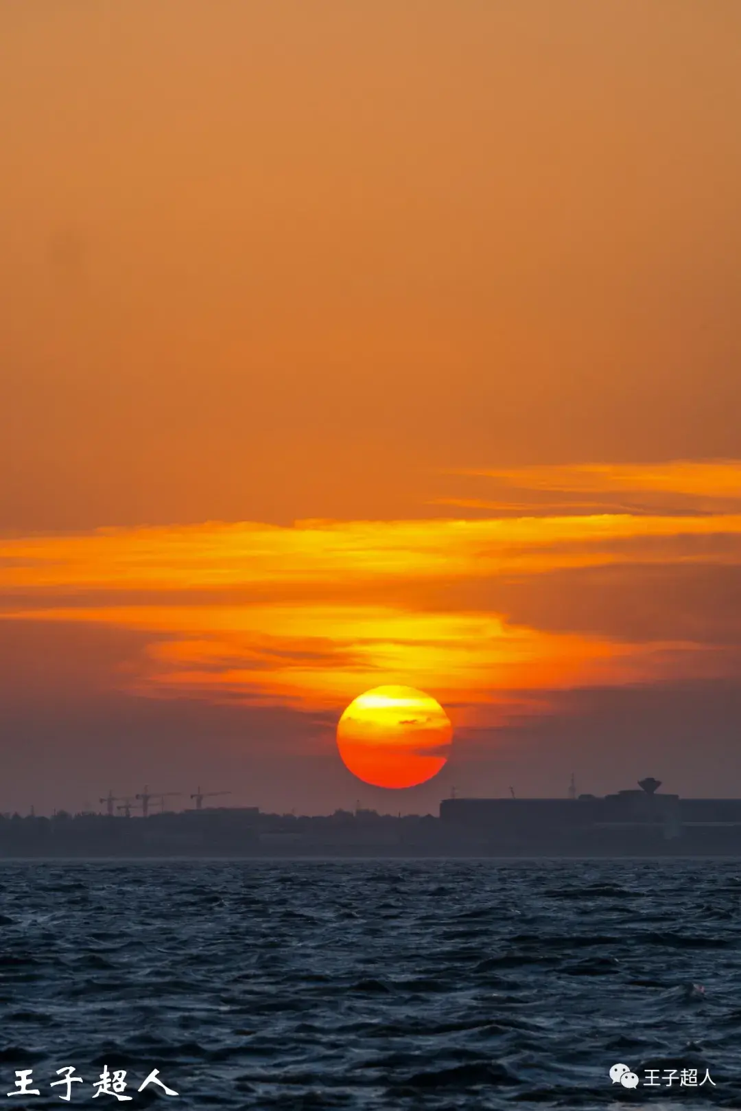 红日之下,是翻滚的江水。这江水流淌了千万年,这红日存在了百亿年,人活一世不过百年。看看地平线上的建筑,那些塔吊,那些钢筋水泥,如果太阳是神灵的望远镜的话,神灵是否会风轻云淡地一笑,我们渺小的个体每天所争夺的名利金钱不过就像这涛涛长江里的一滴水。