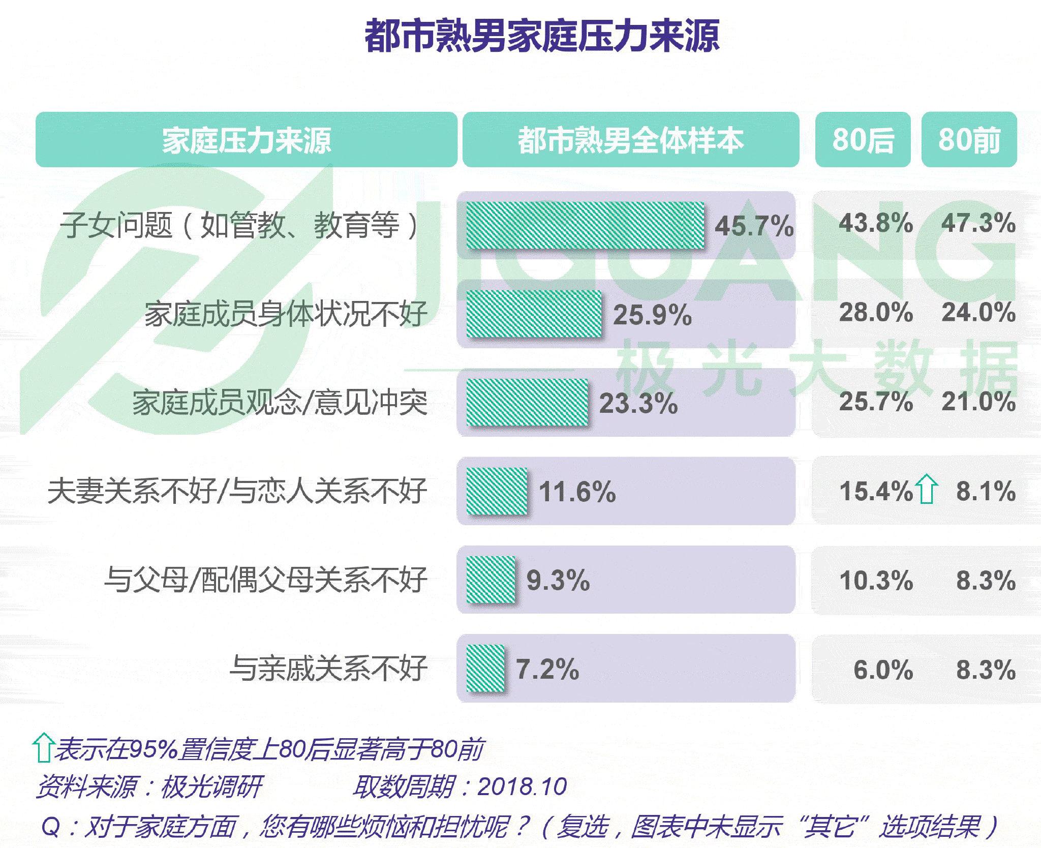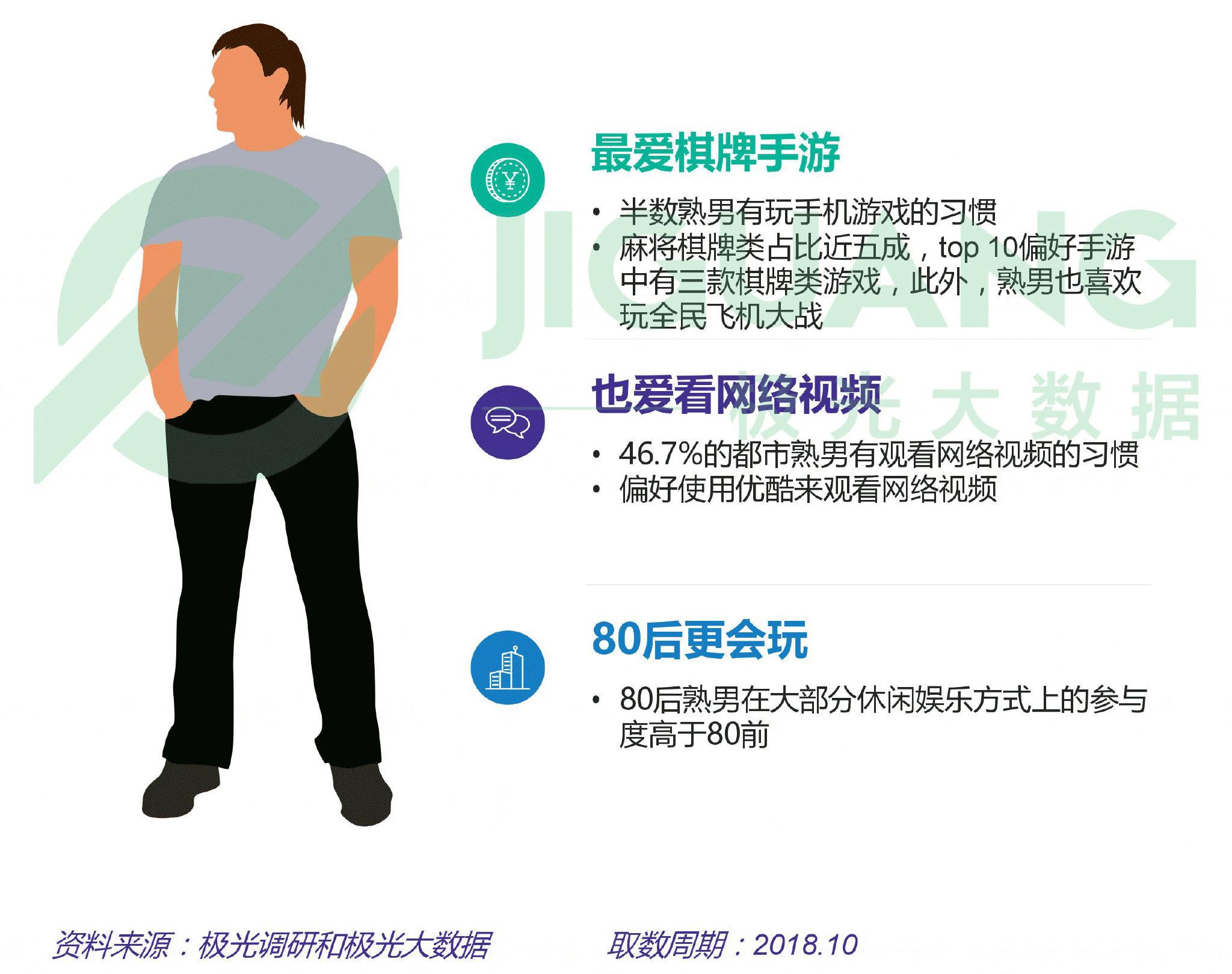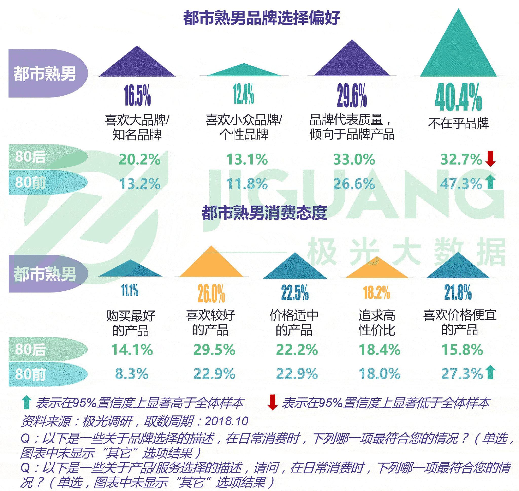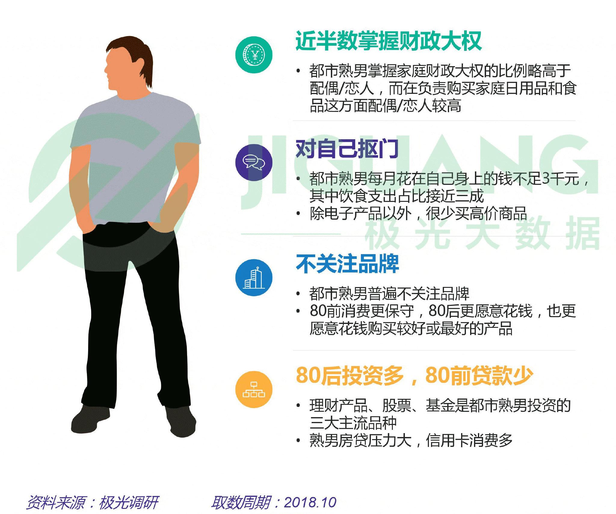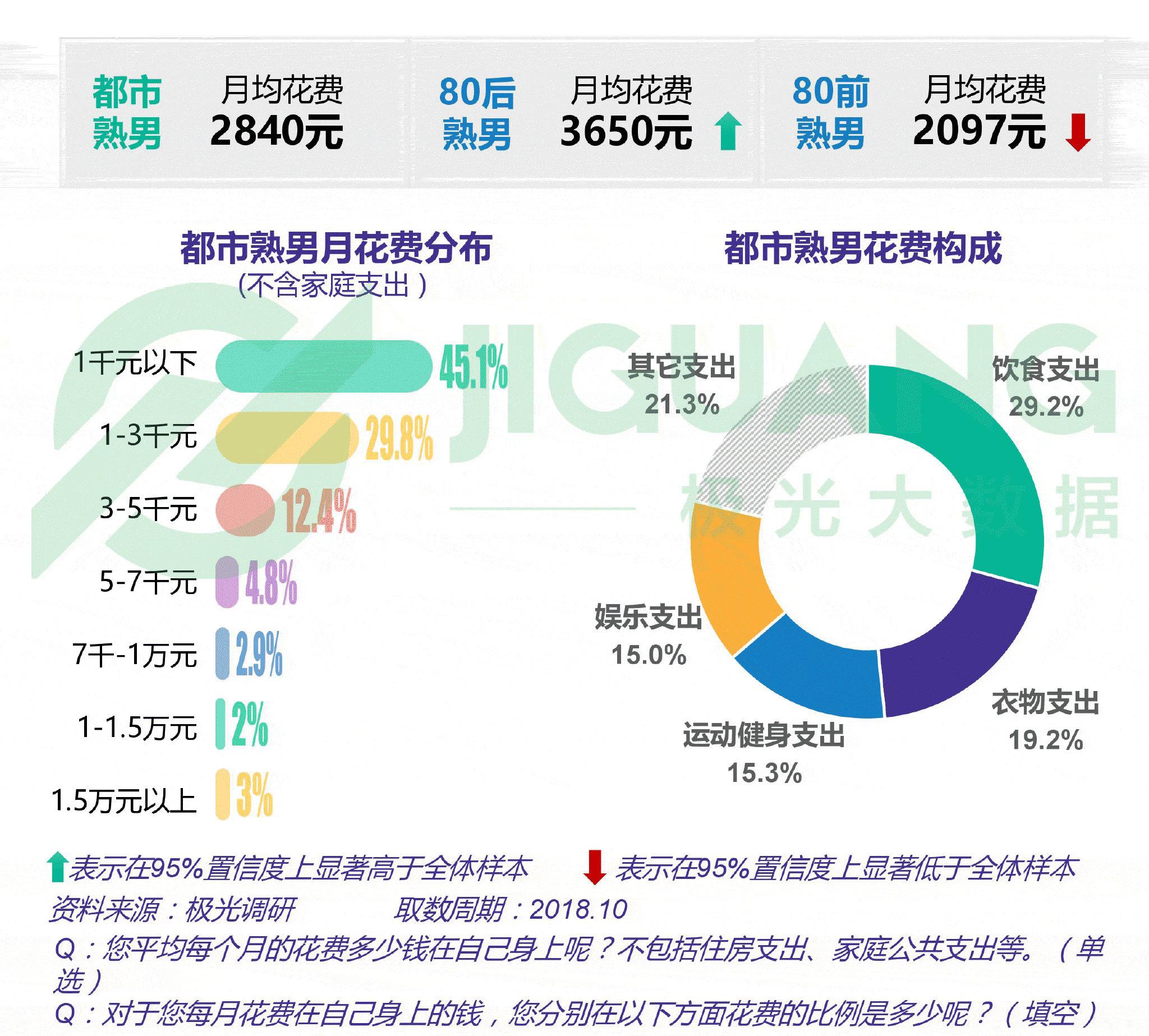 极光大数据,源于极光云服务平台的行业数据采集及极光iAPP平台针对各类移动应用的长期监测,并结合大样本算法开展的数据挖掘和统计分析;调研数据,通过极光调研平台进行网络调研,共回收符合都市熟男定义的用户问卷830份,执行周期为2018年10月