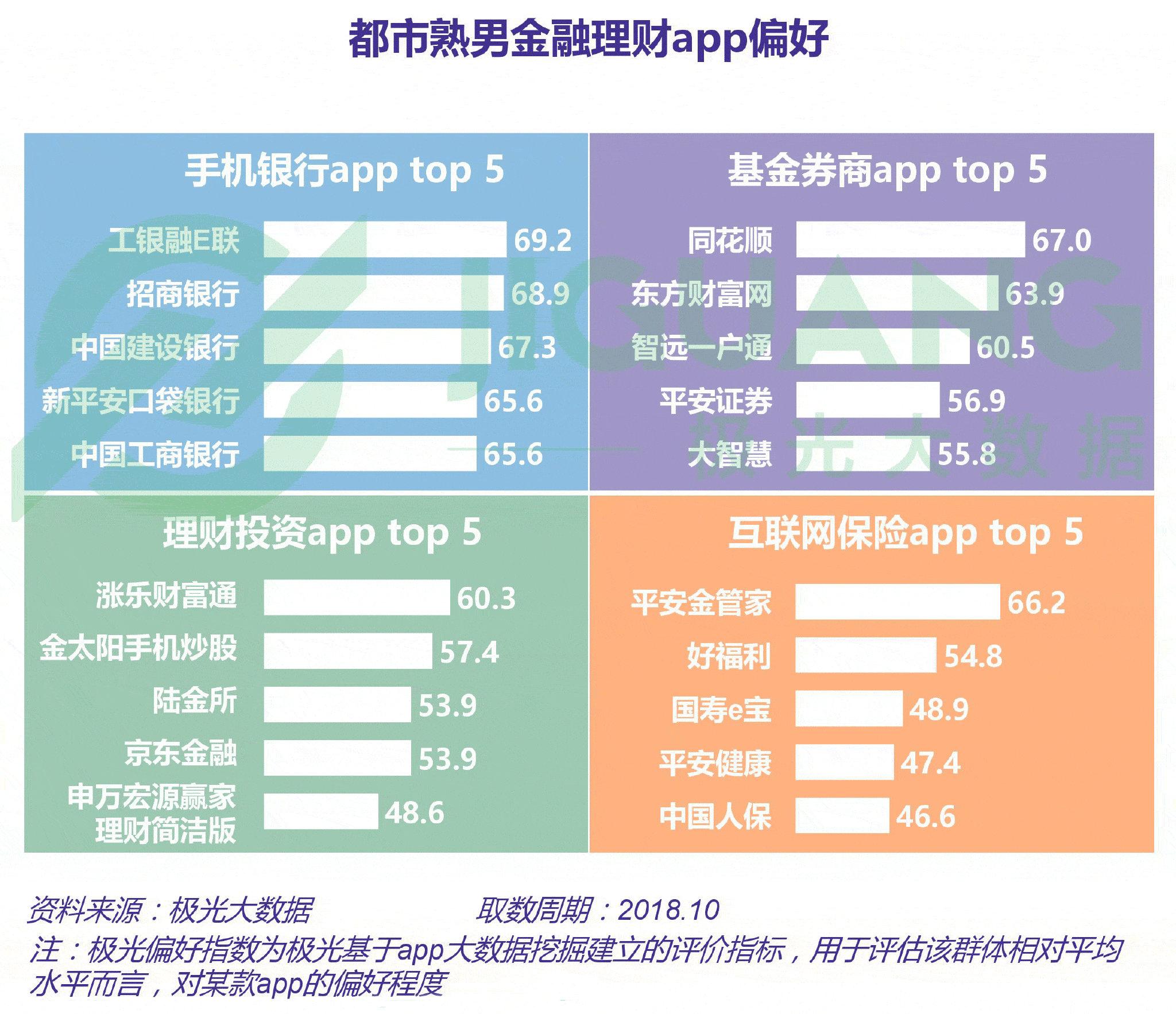 根据极光大数据的调研结果显示,熟男对手机银行app的偏好度相对较高,其中工银融E联最高;基金券商app中,熟男对同花顺和东方财富网的app偏好度相对较高。