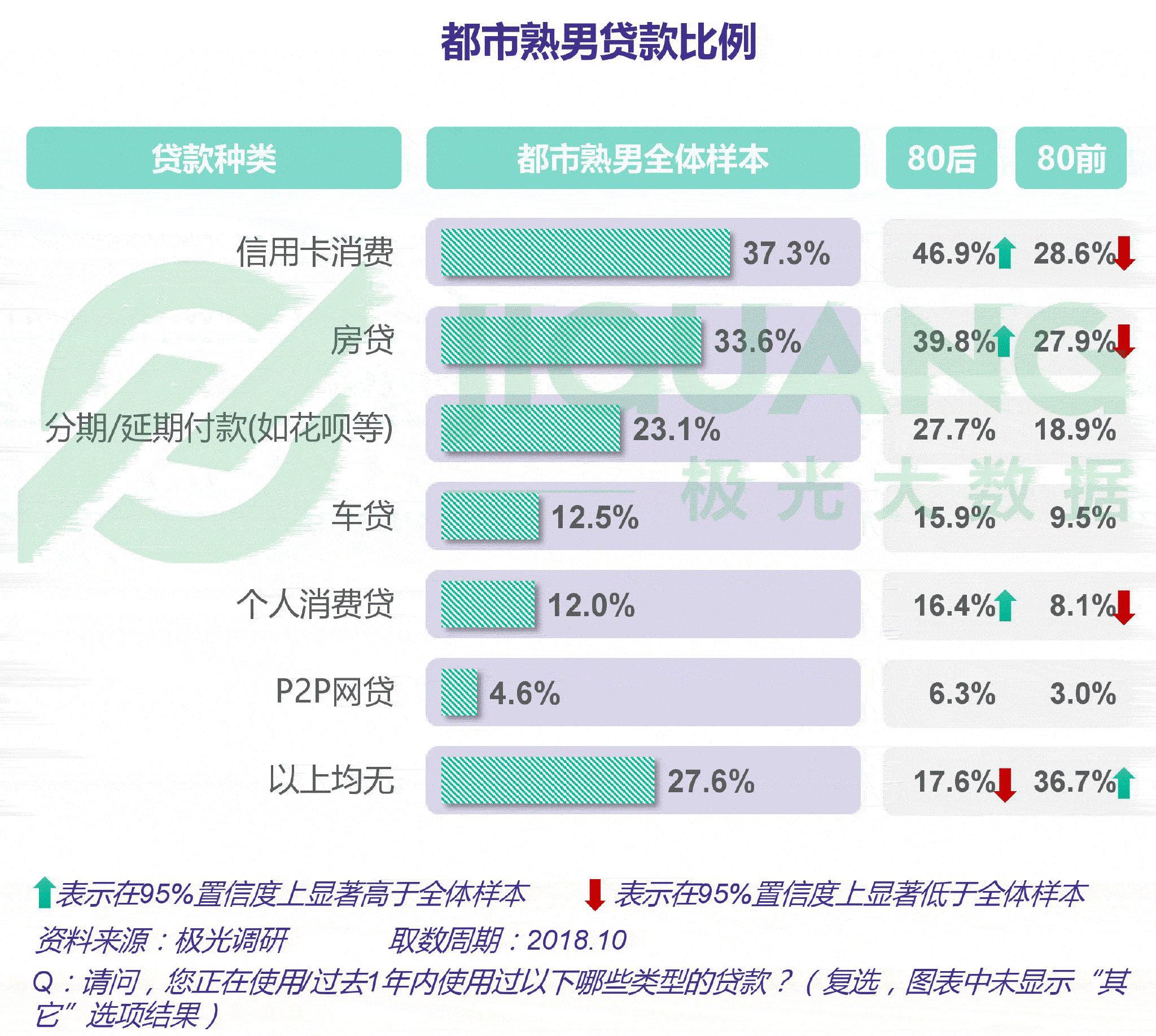 根据极光大数据的调研结果显示,三成多熟男有房贷,其中80后中的占比接近四成。80后更习惯于提前消费,各贷款比重均显著高于80前;而有三成多80前熟男在过去一年没有使用任何贷款。