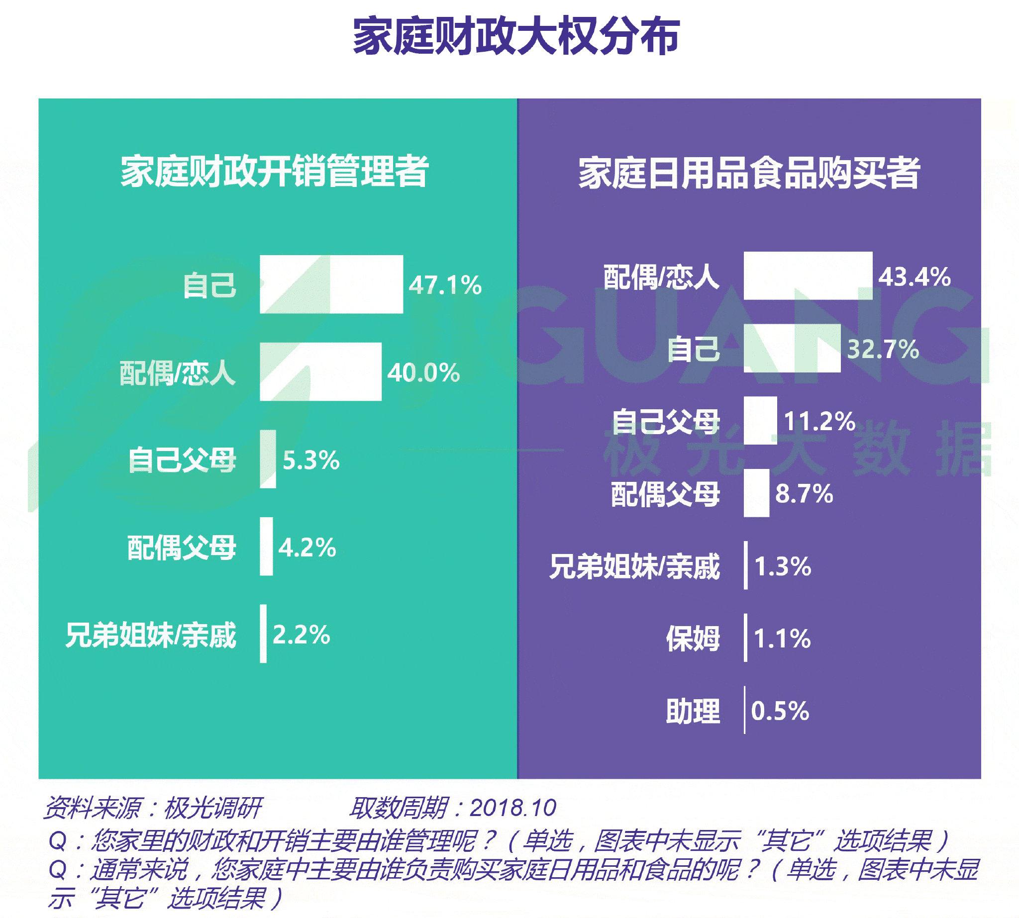 根据极光大数据的调研结果显示,都市熟男掌握家庭财政大权的比例略高于配偶/恋人,占比47.1%,但也有40%的家庭由女性掌握财政大权,由父母/配偶父母掌握财政大权的比重非常低。四成多的家庭由女性负责购买家庭日用品和食品, 高于都市熟男的32.7%,此外,有两成的家庭由父母/配偶父母负责购买。