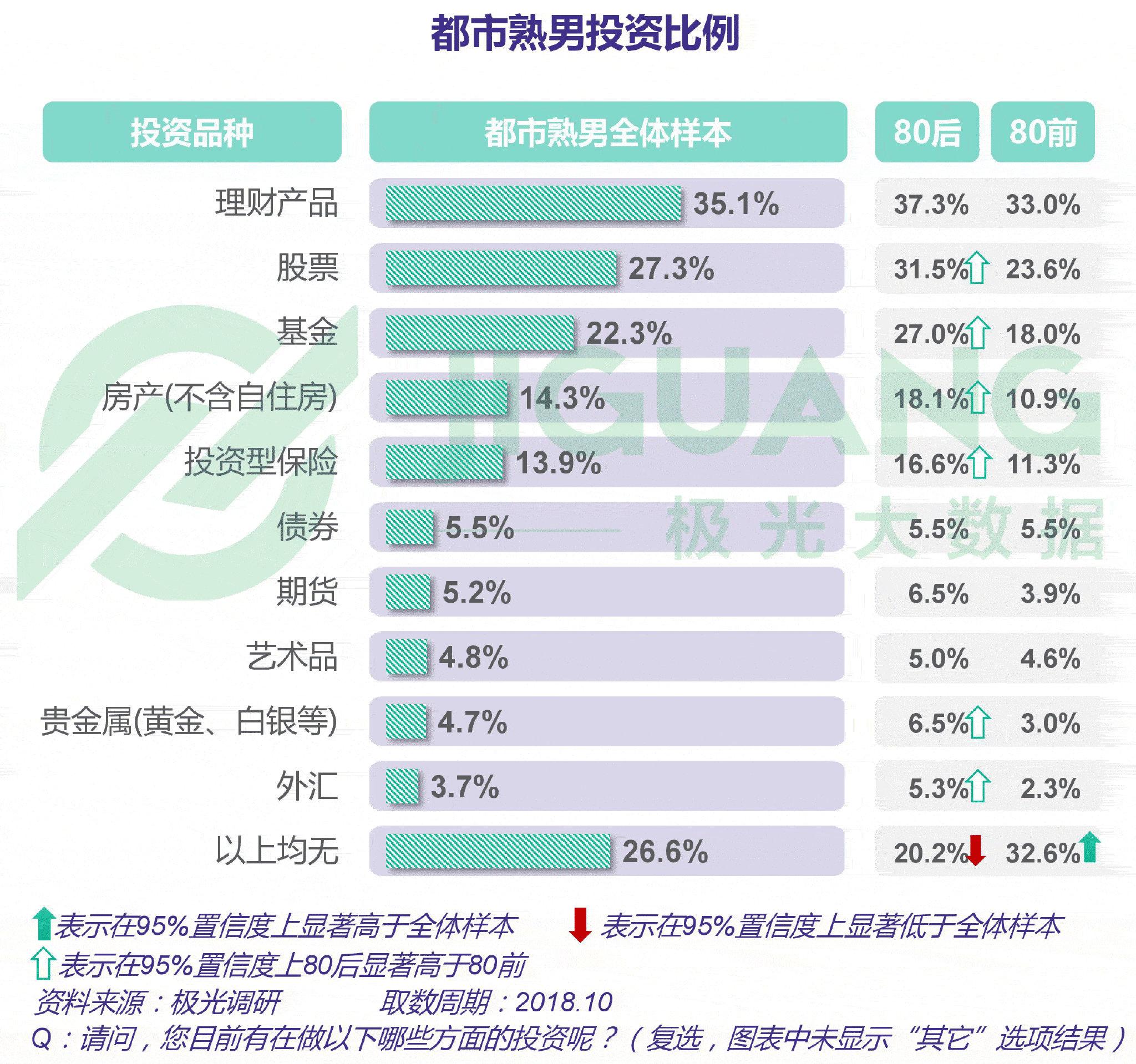 根据极光大数据的调研结果显示,理财产品、股票、基金是都市熟男投资的三大主流品种,其中理财产品最受欢迎,35.1%的熟男都有投资理财产品。超过1/4的都市熟男没有做任何投资,其中80前比例更高,超过三成。