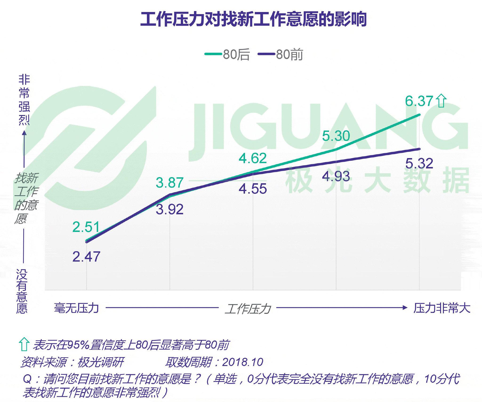 根据极光大数据的调研结果显示,工作压力与找新工作的意愿有显著的正相关关系,工作压力越大,都市熟男换工作的倾向也越高;当工作压力为较小或中等时,80后和80前的换工作意愿非常接近;但当工作压力非常大时,80后换工作的倾向显著高于80前。