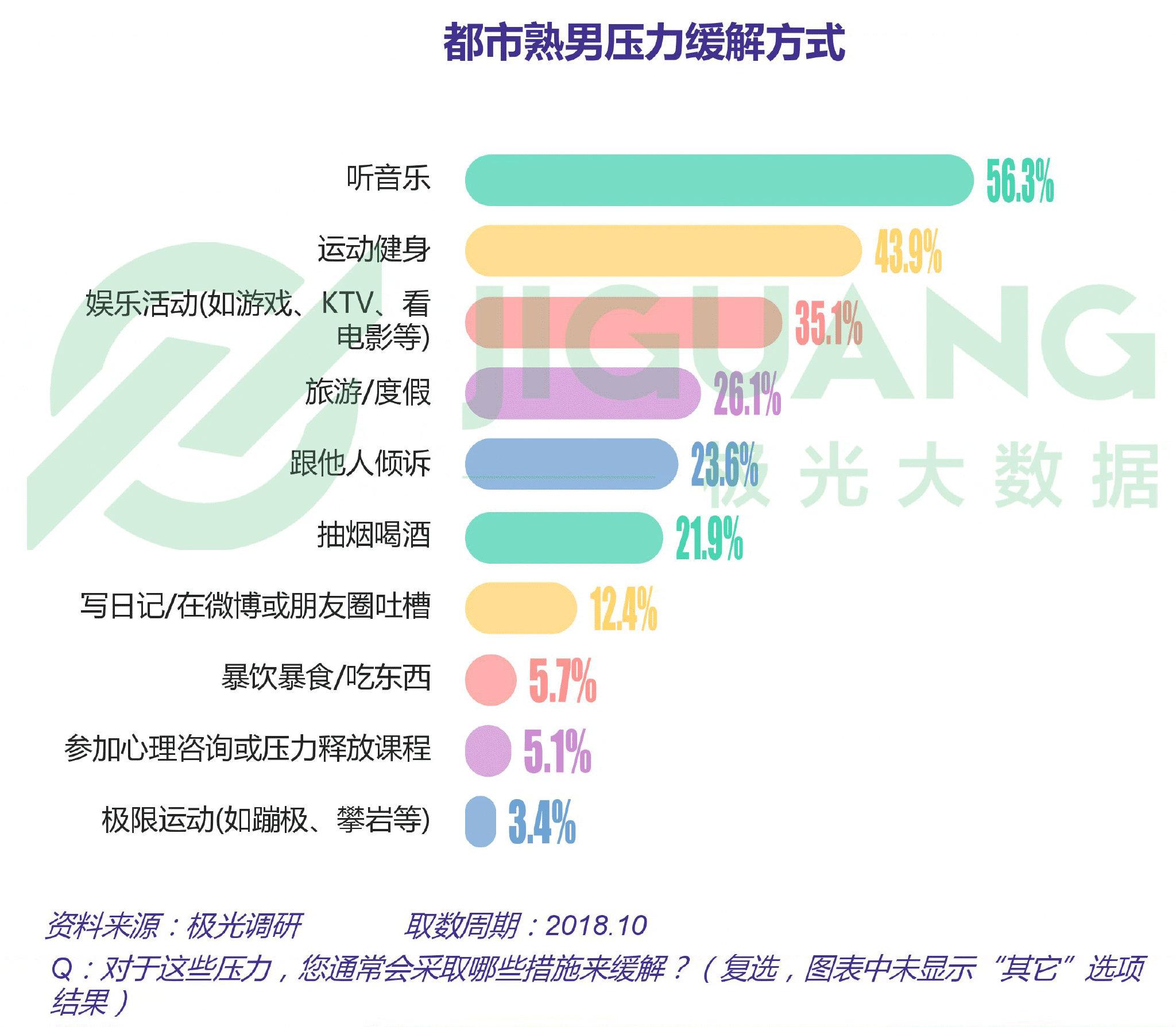 根据极光大数据的调研结果显示,都市熟男的各种压力缓解方式之中,听音乐的比例最高,达56.3%,其次是运动健身,占比为43.9%,游戏/KTV/电影等娱乐活动占比35.1%。都市熟男跟他人倾诉的比例较低,仅为23.6%,而寻求心理咨询或压力释放课程等专业帮助的仅为5.1%,比例极低。