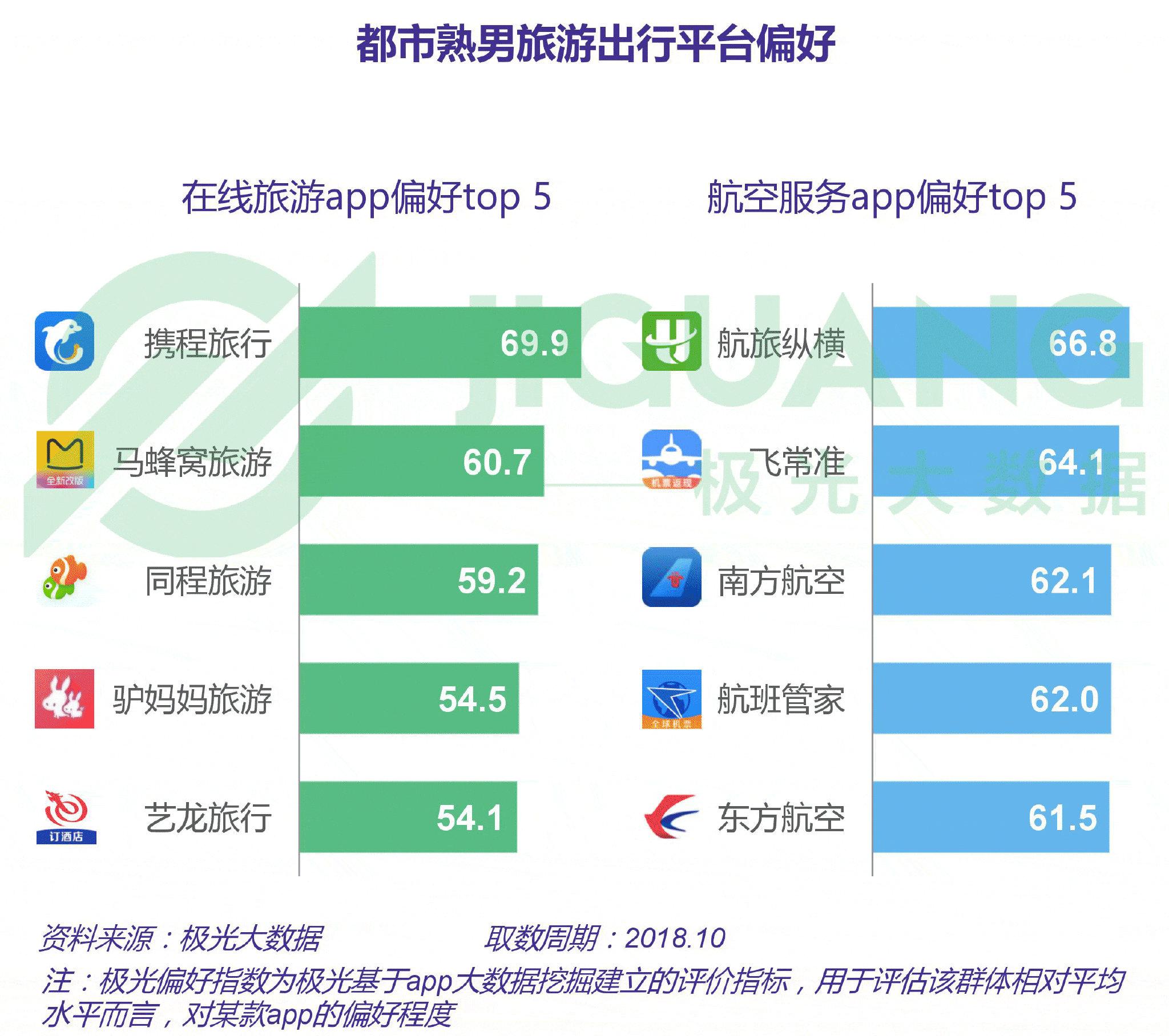 根据极光大数据的调研结果显示,在线旅游app中,熟男对携程旅行的偏好度达69.9,高于其它app;在航空服务app中,熟男的top 5 app的偏好度非常接近,其中航旅纵横最高,为66.8。