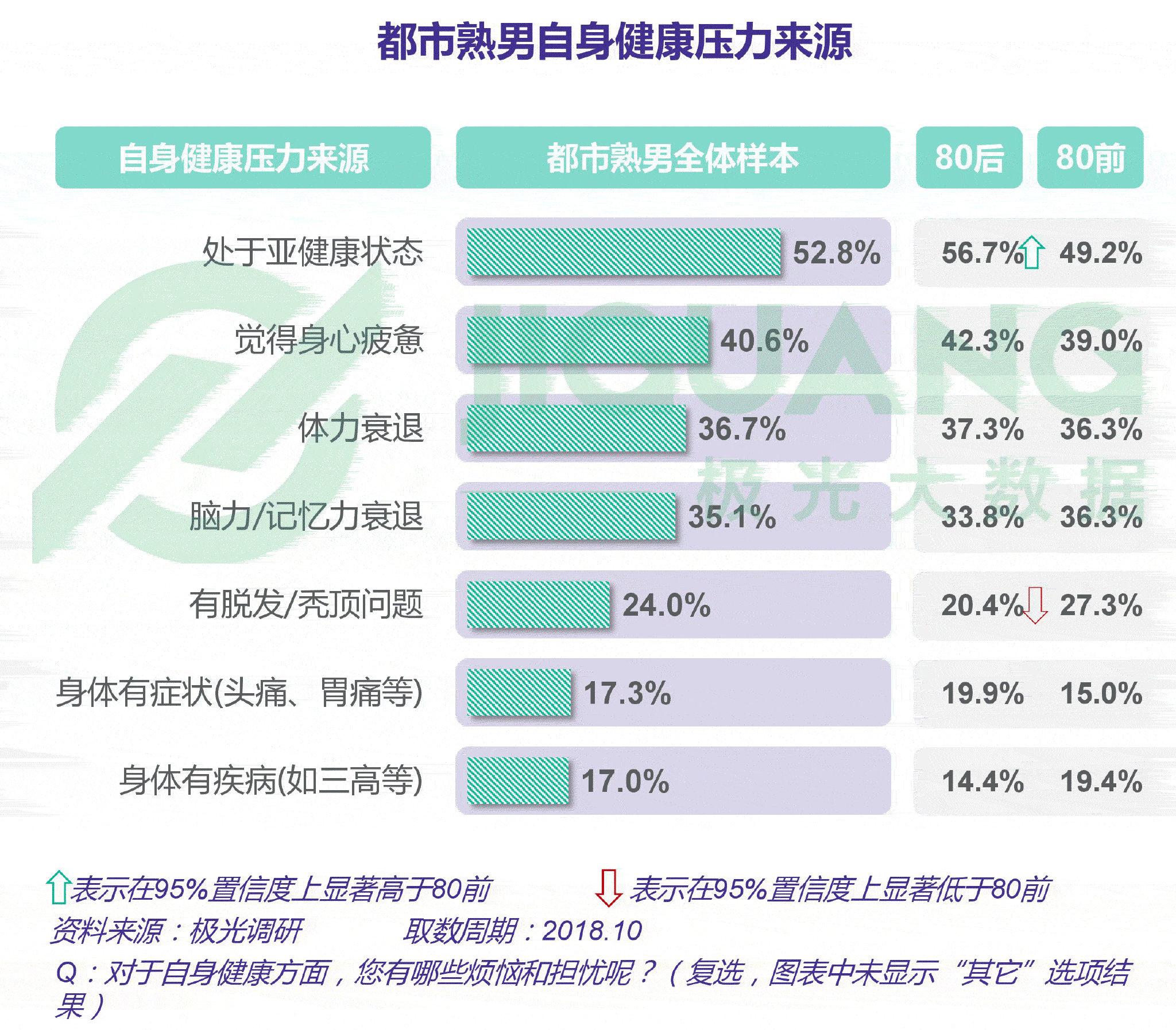 根据极光大数据的调研结果显示, 四成熟男觉得身心疲惫,三成多熟男觉得体力衰退和脑力/记忆力衰退。接近1/4的熟男有脱发/秃顶问题,其中80前的比例更高。