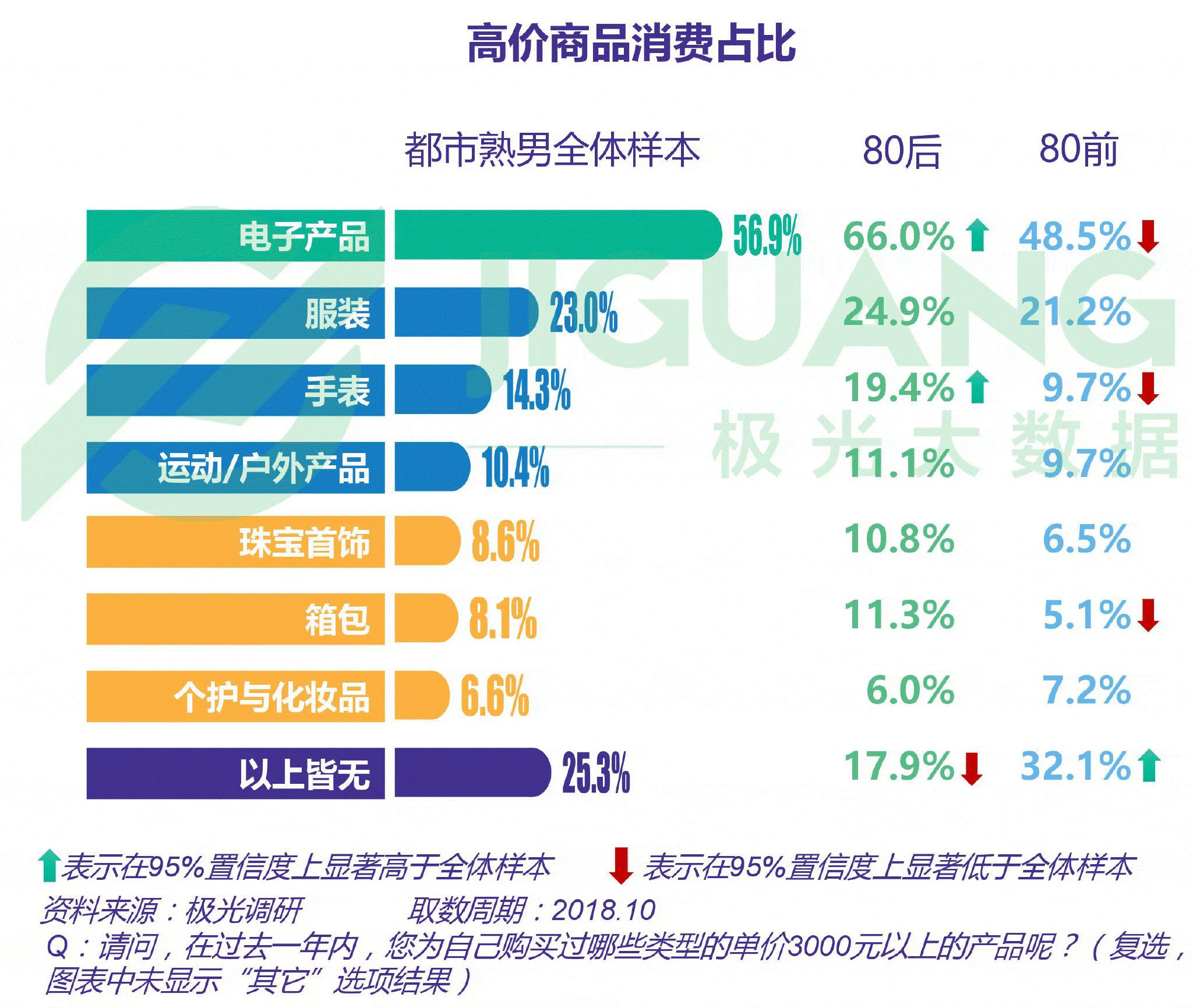 根据极光大数据的调研结果显示,对于单价超过3千元的高价商品,都市熟男购买比例最高的为电子产品,达56.9%,其次为服装,占比23.0%,其余品类占比较低,更有1/4的熟男在过去一年内从未购买高价商品。80后相对来说购买高价商品的意愿高于80前,后者有超过三成人一年内从未购买高价商品。
