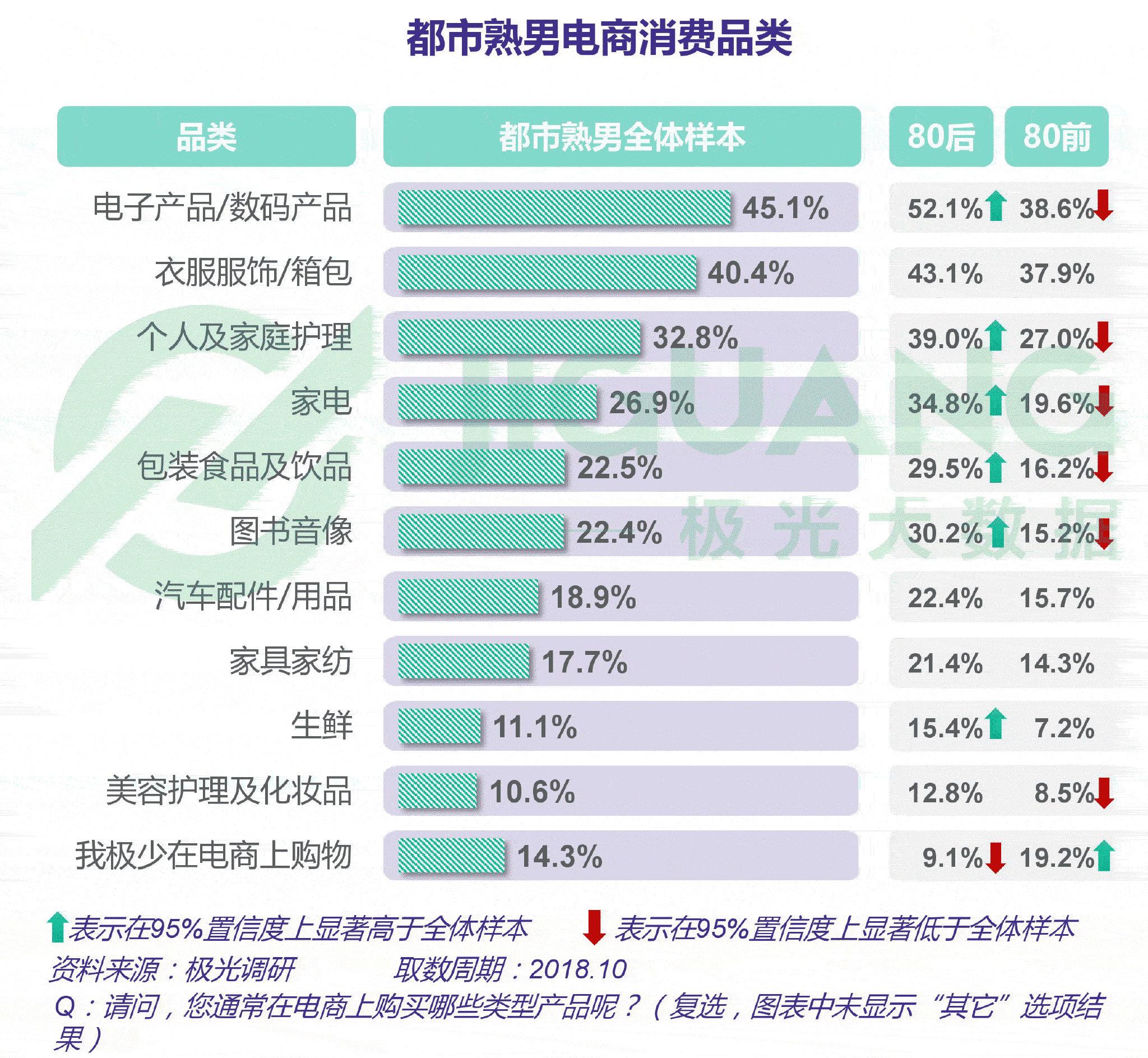 根据极光大数据的调研结果显示,熟男在电商上最常购买电子产品和衣物箱包。相对于80前,80后熟男更热衷于在电商上购物,并且购买的品类种类也相对较多。