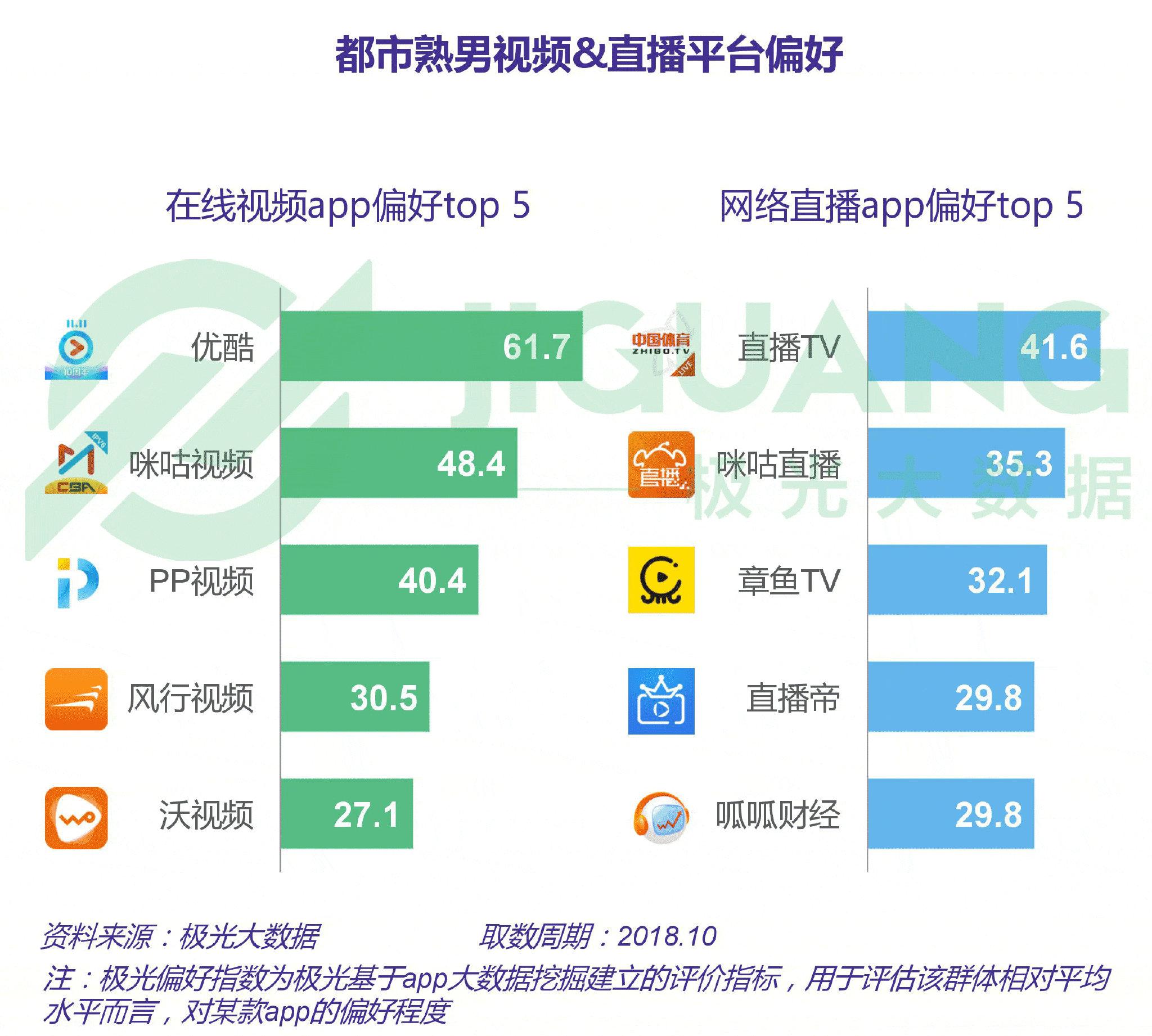 根据极光大数据的调研结果显示,都市熟男偏对在线视频app的偏好度差异较大,优酷一枝独秀,偏好度达61.7,咪咕视频48.4位于第二;而对网络直播app的偏好度相对较低,其中直播TV的偏好度最高,为41.6。