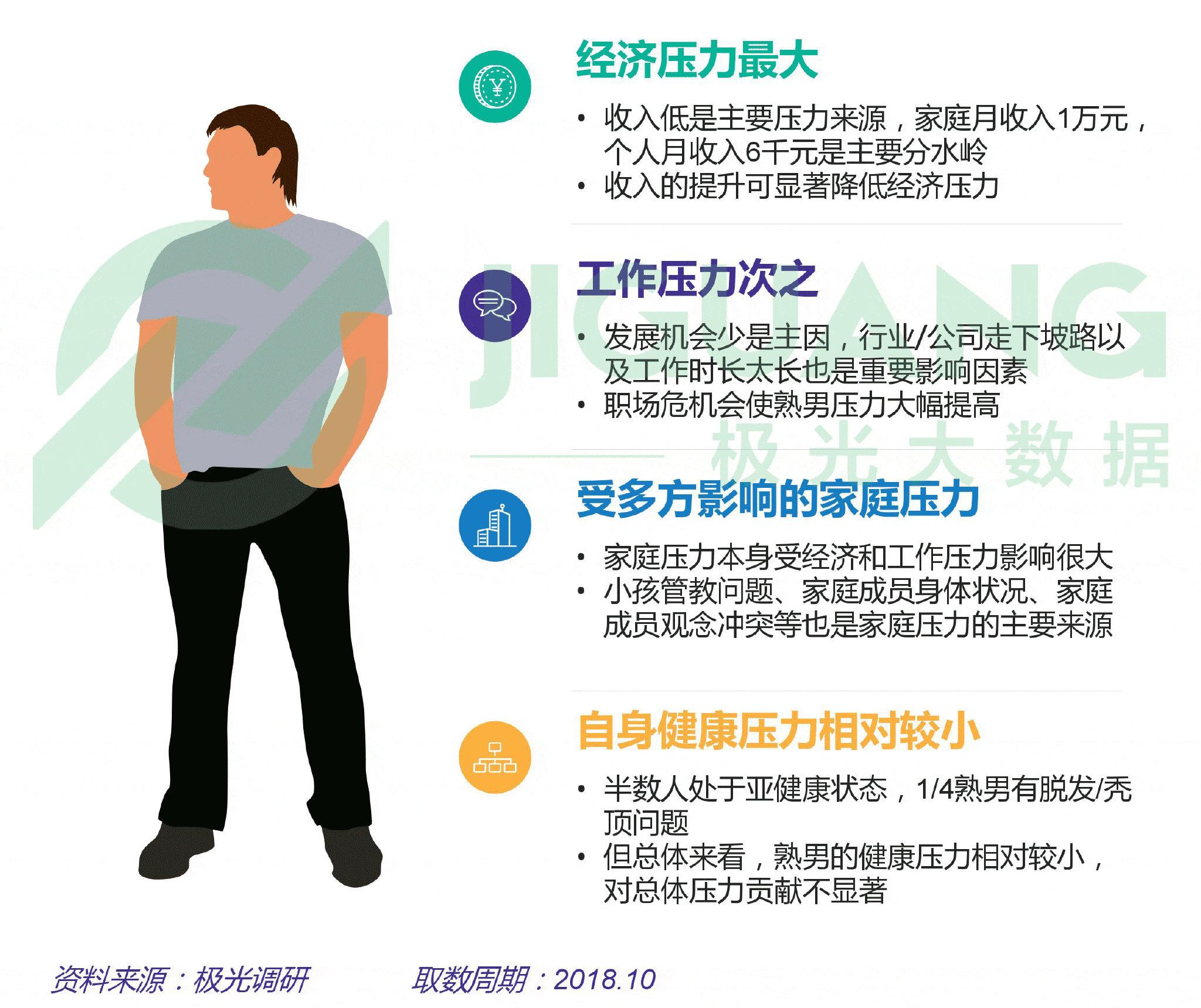 根据极光大数据的调研结果显示,经济、工作、家庭是熟男头上的三座大山,其中,经济压力影响最大。经济压力和工作压力对总体压力有两条影响路径:一方面直接提高总体压力,另一方面通过提高家庭压力进而提高总体压力,其中,经济压力对总体压力的总贡献最大,达0.482。而个人收入的提高能显著降低经济压力。自身健康压力直接受到三大压力的影响,但其本身对总体压力的影响并不显著。
