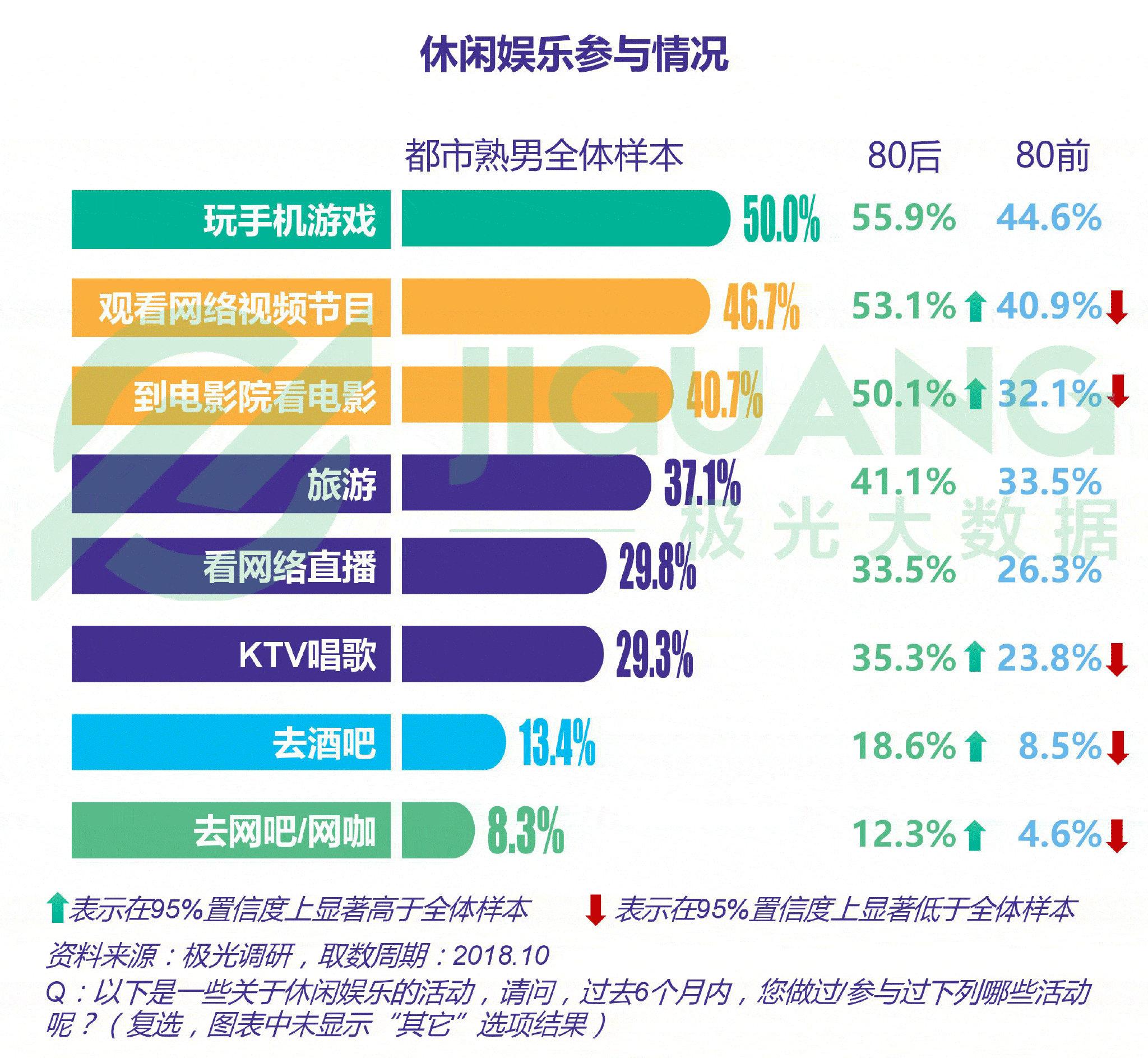 80后更会玩对于忙碌的都市熟男来说,棋牌类手游和网络视频是最好的休闲娱乐方式,或者到电影院看一场电影、抽出时间到外地旅游也是不错的选择,其中,80后在各项休闲娱乐方面参与度更高