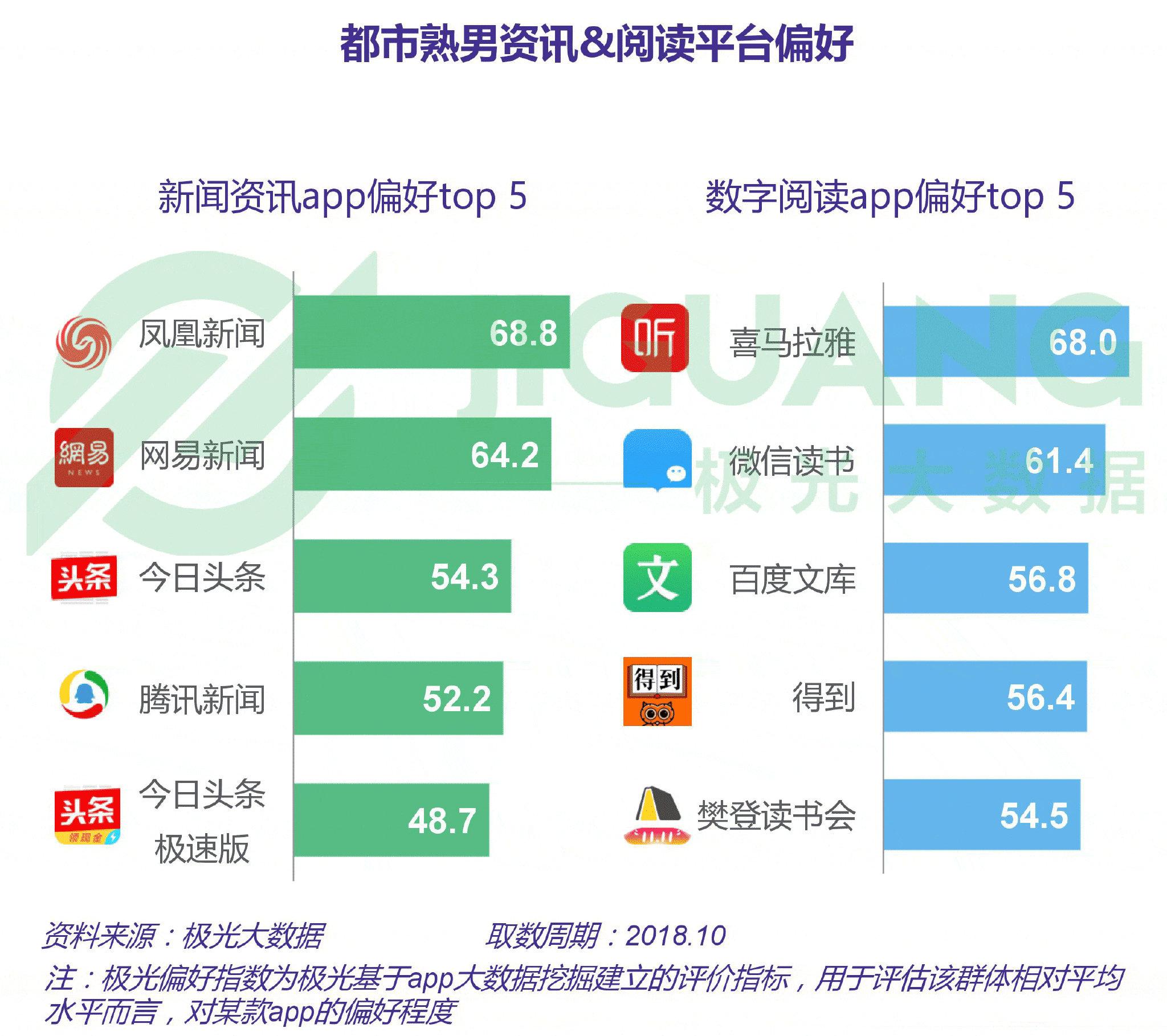根据极光大数据的调研结果显示,新闻资讯app中,都市熟男最偏好凤凰新闻,其次是网易新闻;数字阅读app中,都市熟男最偏好喜马拉雅,其次为微信读书。