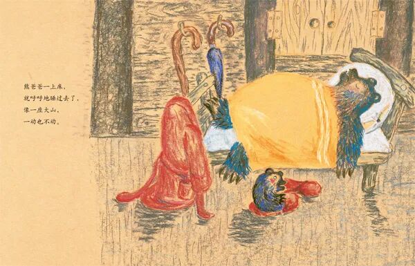 故事发生在只有母子长期生活在一起的家庭。熊爸爸总是外出工作,当他回来时,“背着装满礼物的背包”。他一上床就呼呼地睡过去,像一座大山,一动也不动。